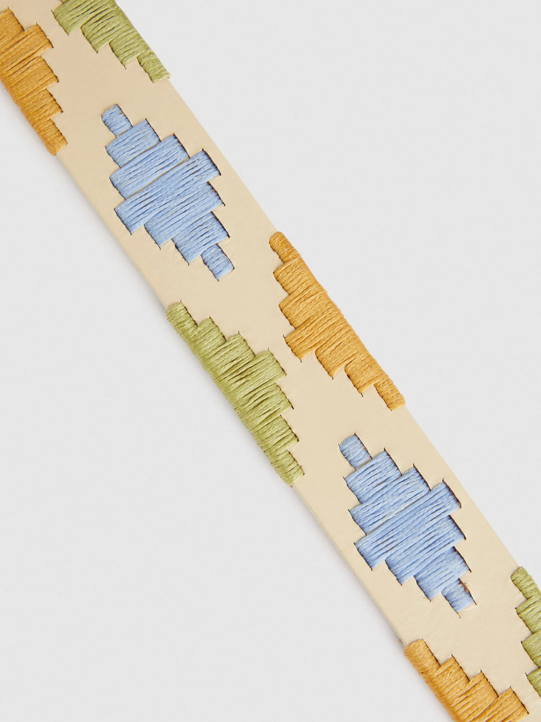 Cinturón con detalles personalizados estilo étnicos y cierre central mediante hebilla metálica y pasador al tono.