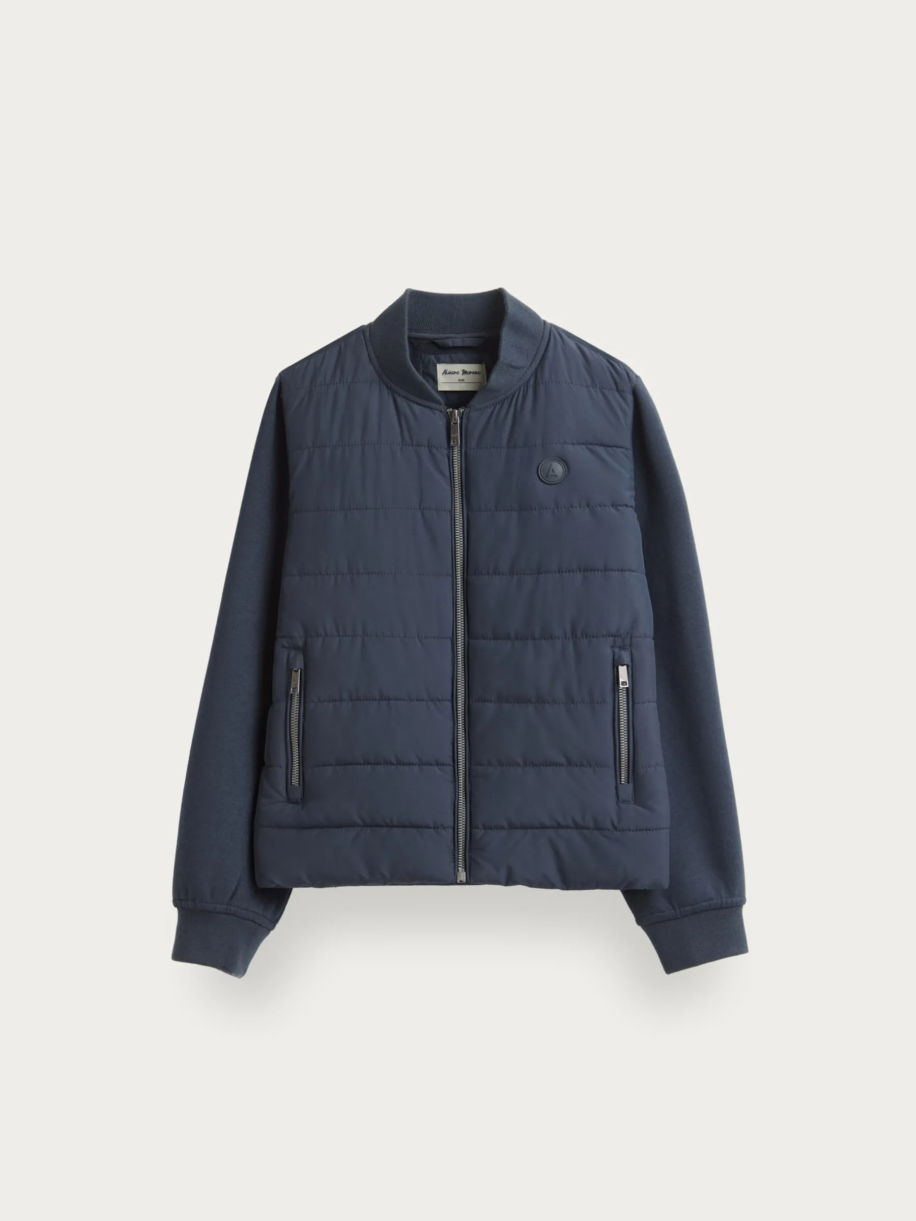 Cazadora estilo bomber con cuello y mangas en tejido de punto. Cuenta en su parte delantera con cierre central mediante cremallera, dos bolsillos y parche con el logo de la marca grabado en el pecho.