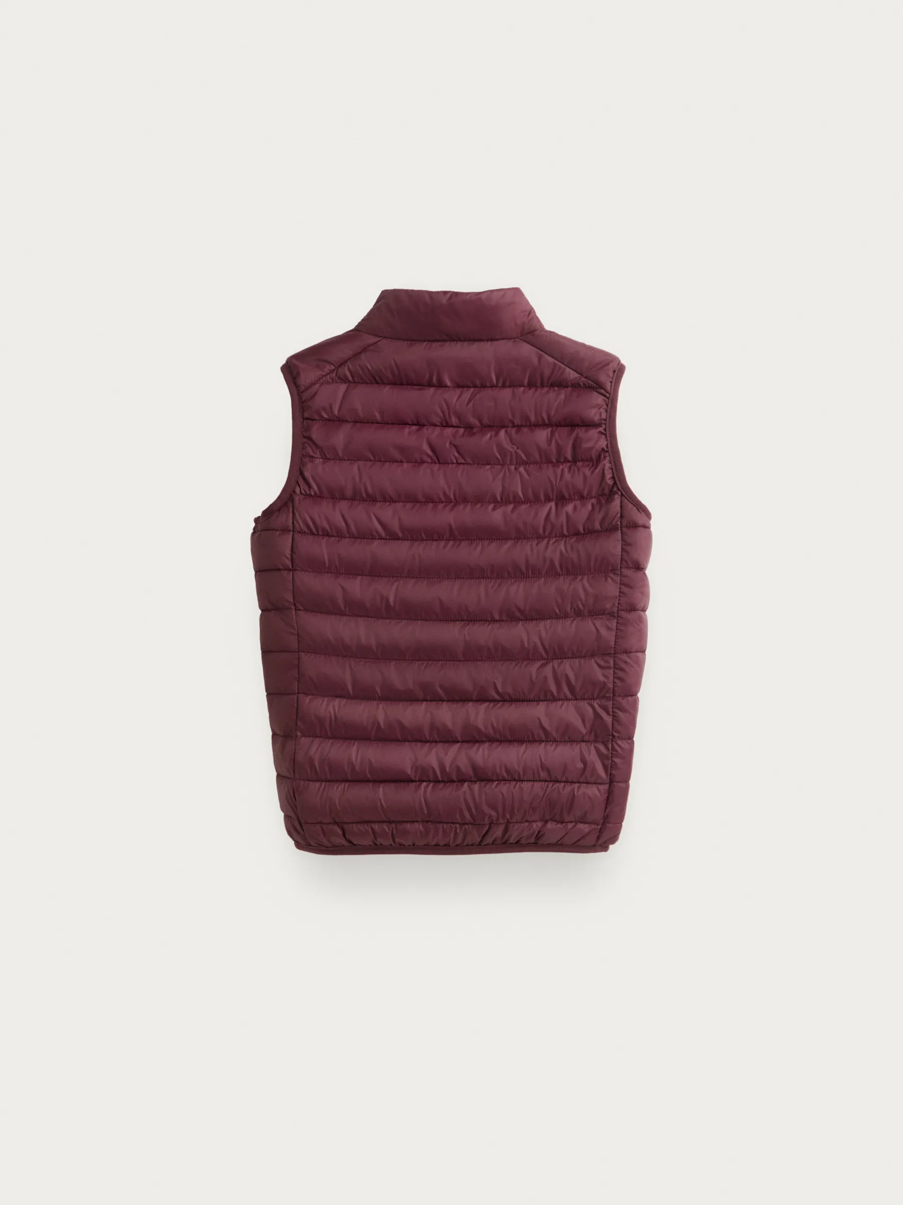 Chaleco acolchado con cuello subido y cierre central mediante cremallera, dos bolsillos a la altura de la cintura y logo de la marca grabado en el pecho. Elástico en la sisa y cintura. Forro interior a contraste con bolsillos.