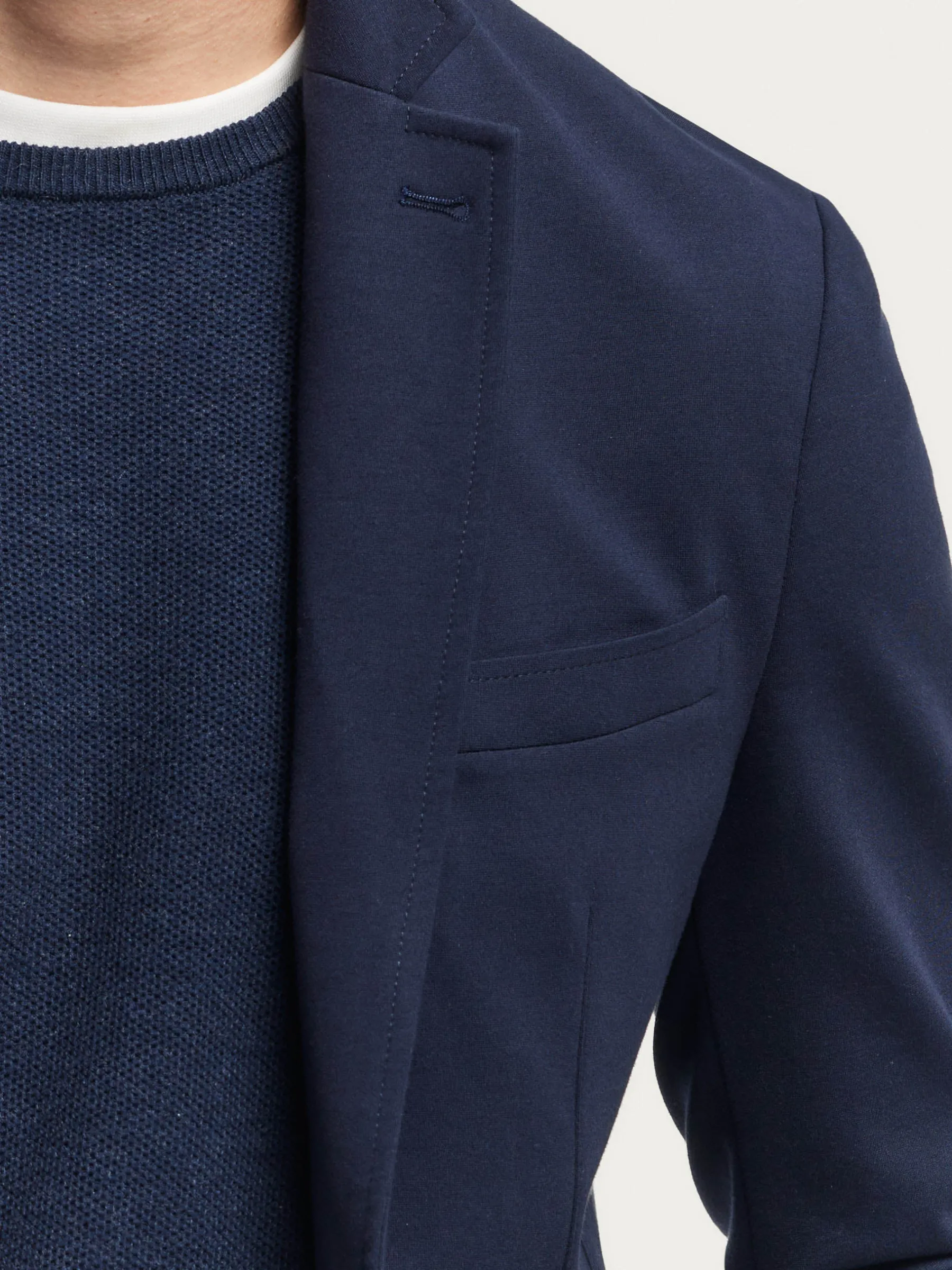 Americana confeccionada en tejido de punto de corte slim fit. Cuenta con cuello y solapa, cierre central simple mediante dos botones y puños con botones decorativos. Pinzas en el frontal, dos bolsillos de parche en la cintura y un bolsillo a la altura del pecho. Dos bolsillos en su interior.