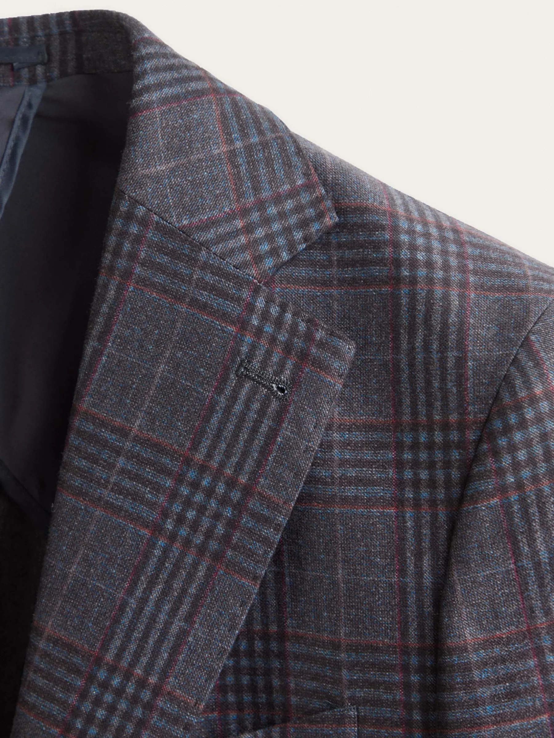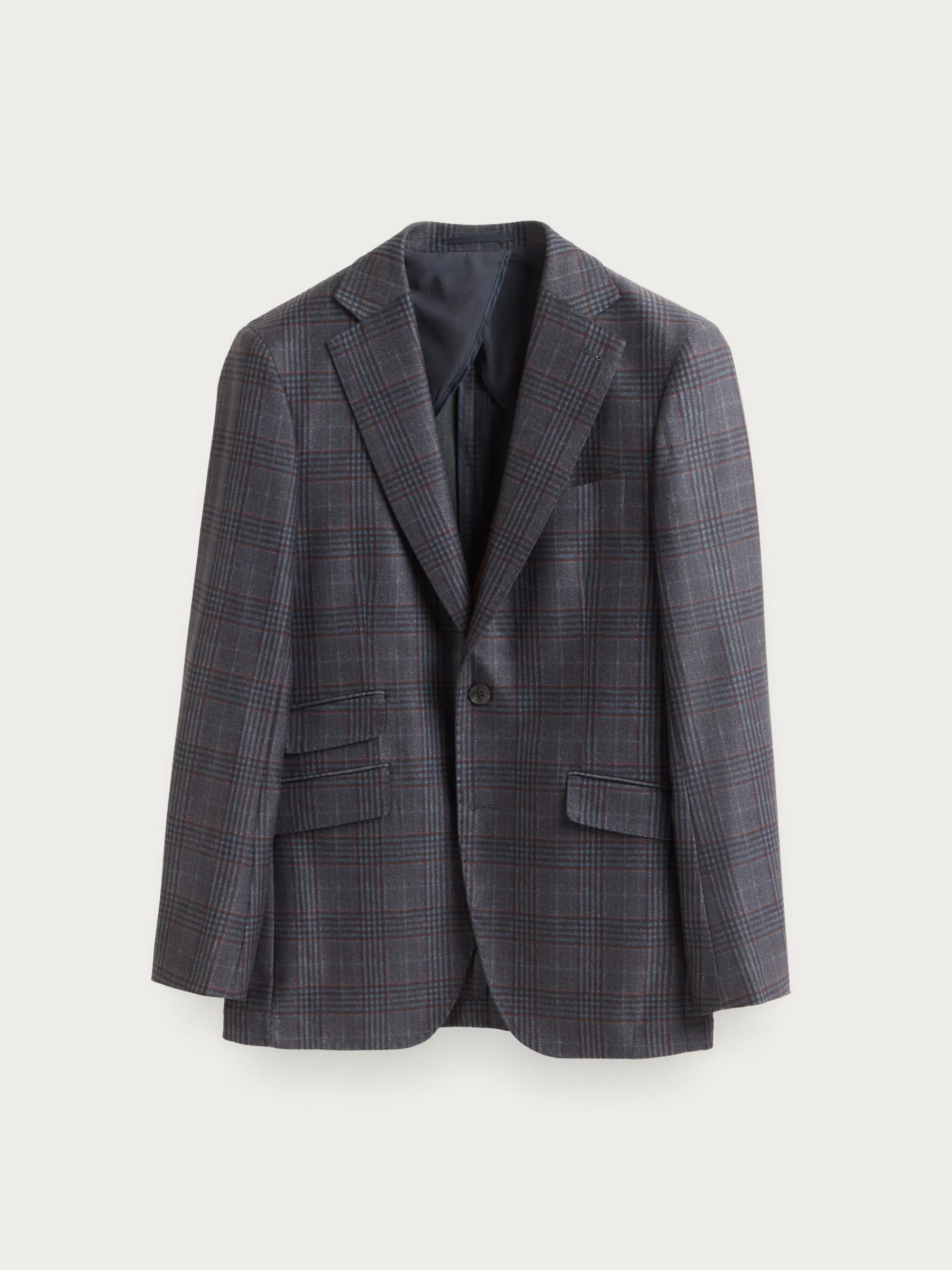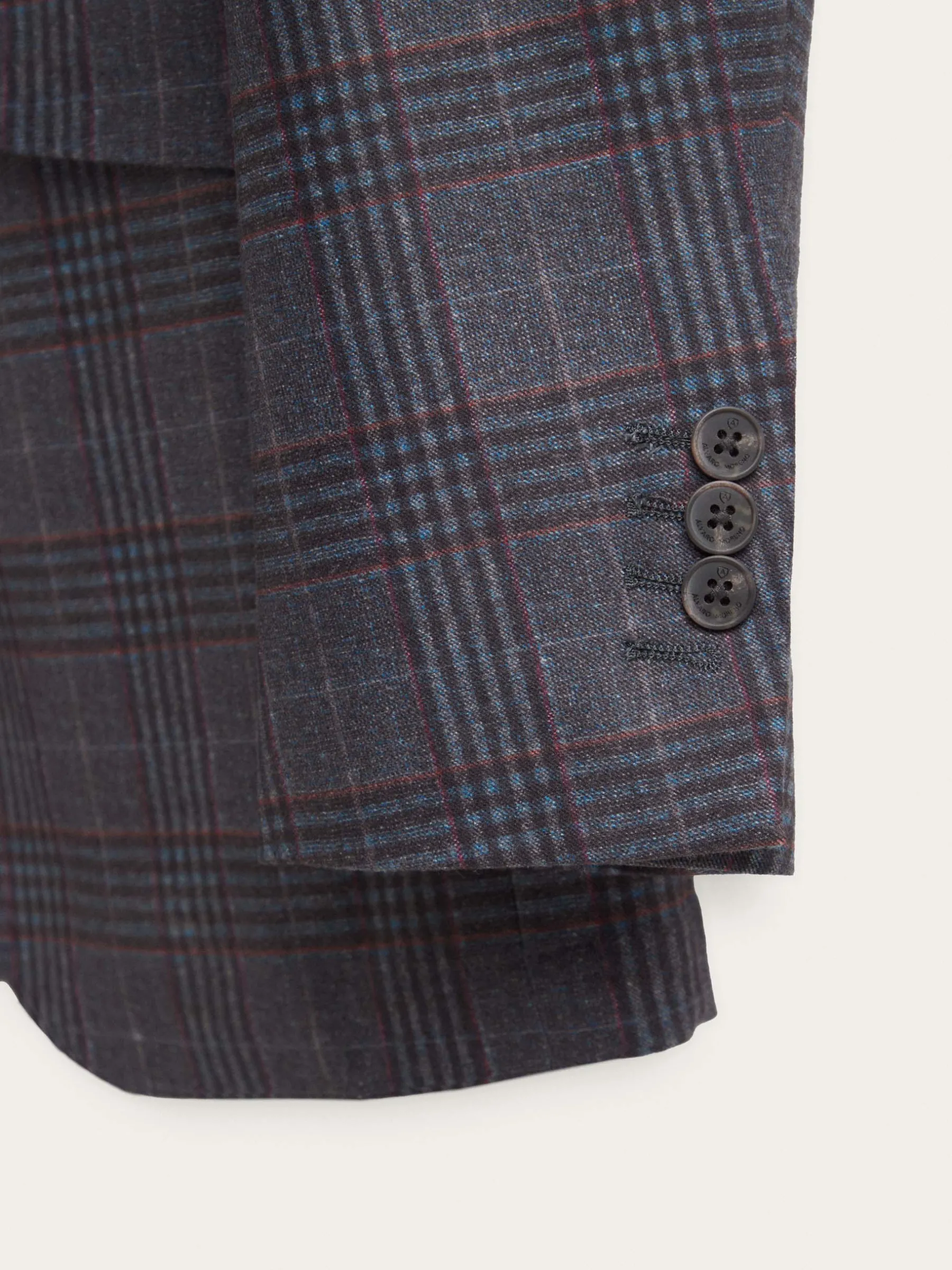Americana confeccionada en tejido a cuadros de corte slim fit. Cuenta con cuello y solapa, cierre central simple mediante dos botones y puños con botones decorativos. Pinzas en el frontal, tres bolsillos de solapa en la cintura y un bolsillo a la altura del pecho. Dos bolsillos en el interior.