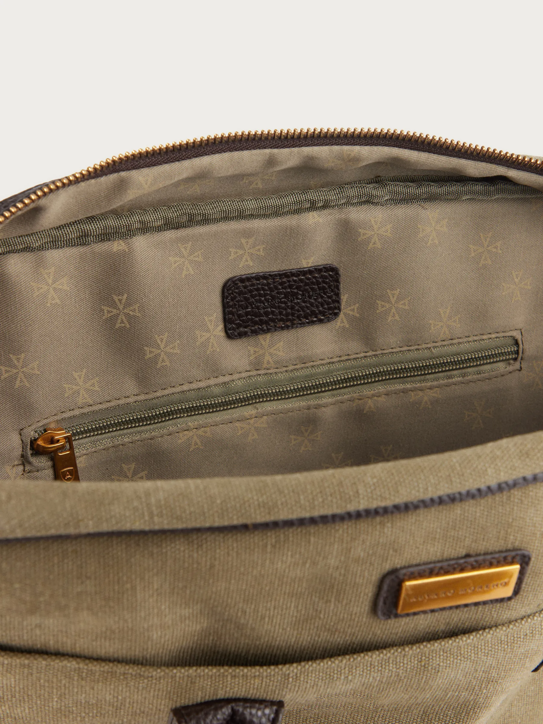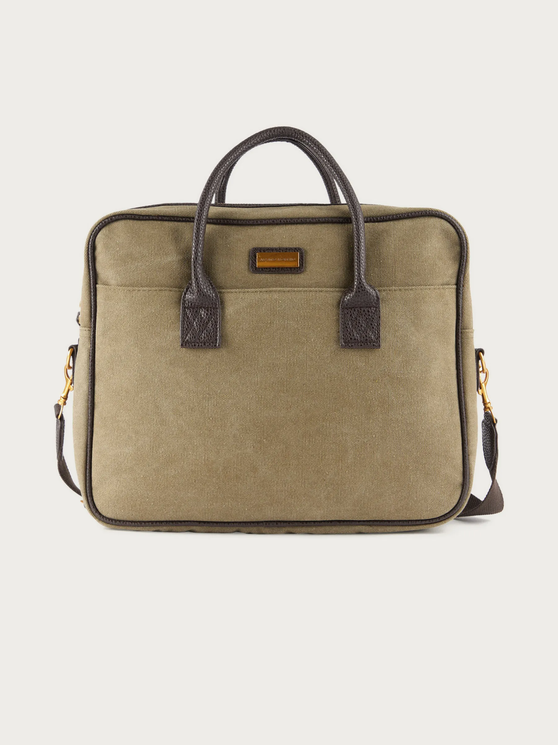 Maletín con asas superiores y correa desmontable por mosquetones. Cuenta con un amplio compartimento principal de cierre mediante cremallera, bolsillo interior y dos bolsillos exteriores. Detalles personalizados en efecto piel. Forrado en su interior.