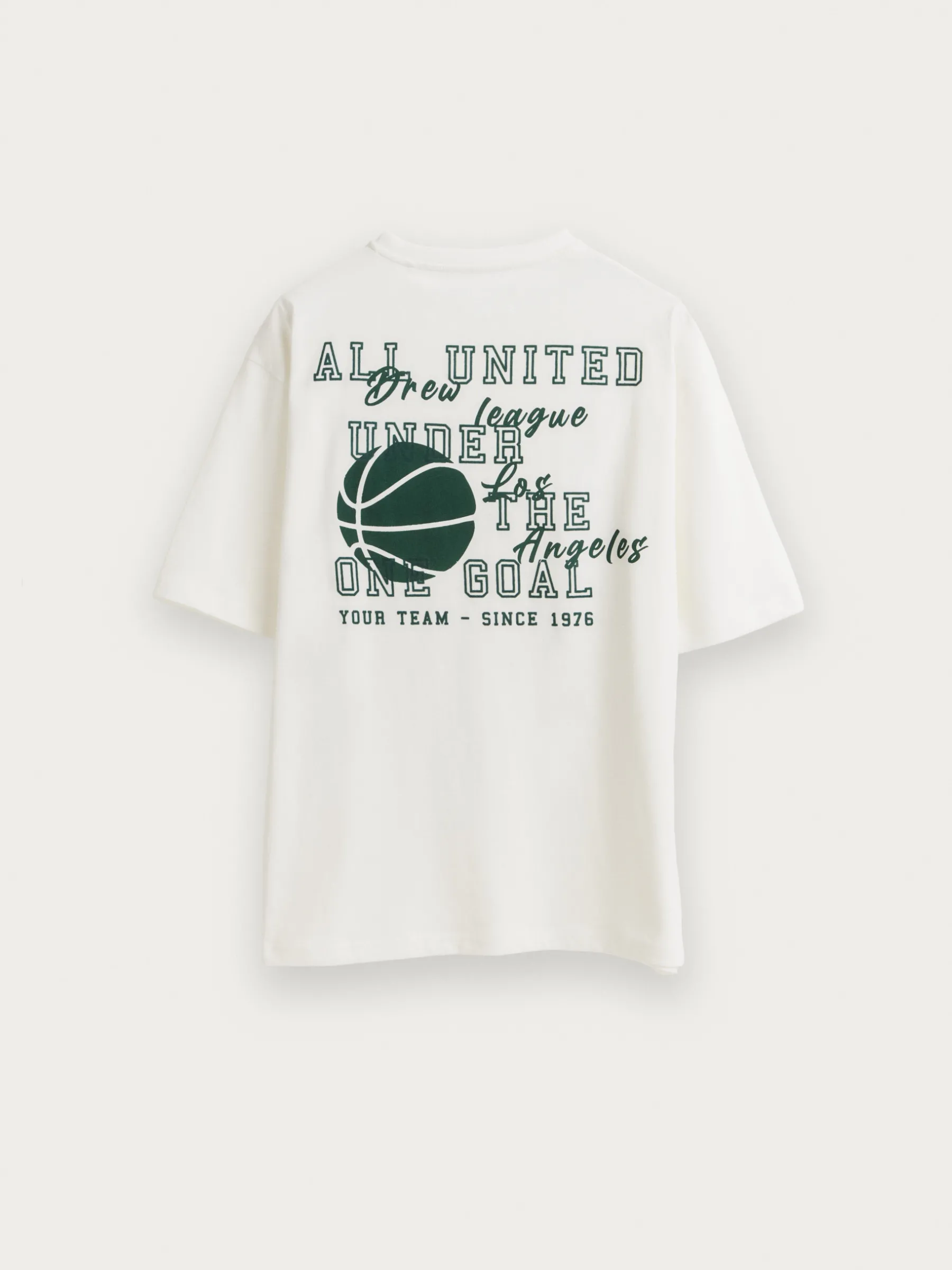 Camiseta de corte relaxed fit aportando un corte más relajado. Cuenta con estampado personalizado en el frontal y en la parte trasera, cuello redondo y manga corta ligeramente más anchas y largas.