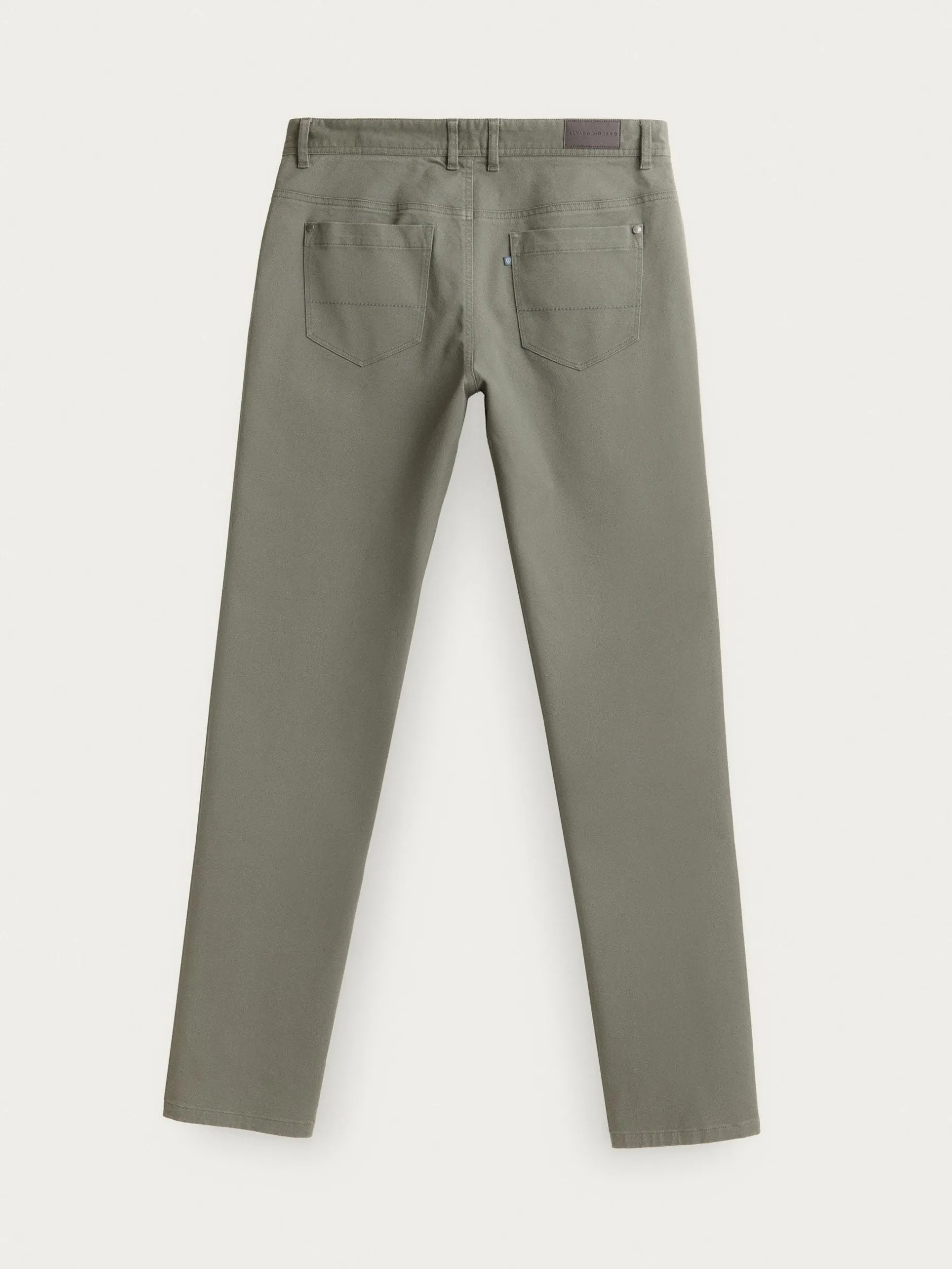 Pantalón de corte slim fit con 5 bolsillos. Cierre central mediante botón y cremallera, bolsillo cerillero y dos bolsillos traseros con pespunte al tono. Etiqueta personalizada en la cinturilla en aspecto piel.