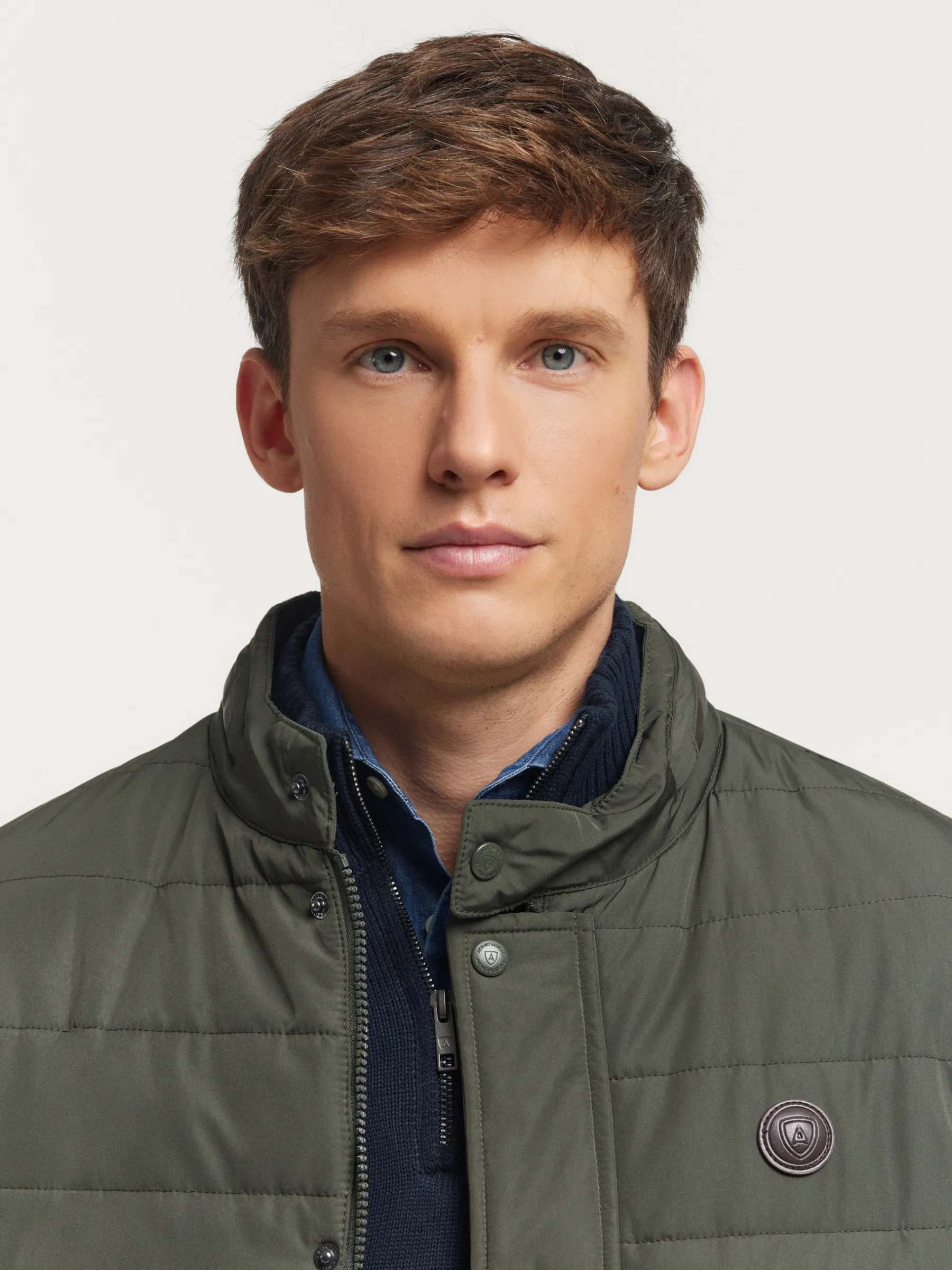Cazadora acolchada con cuello subido y cremallera decorativa. Cuenta con cierre central de cremallera oculta por tapeta de botones a presión, manga larga con puños ajustables y dos bolsillos en la cintura. Parche en el pecho con el logo de la marca.