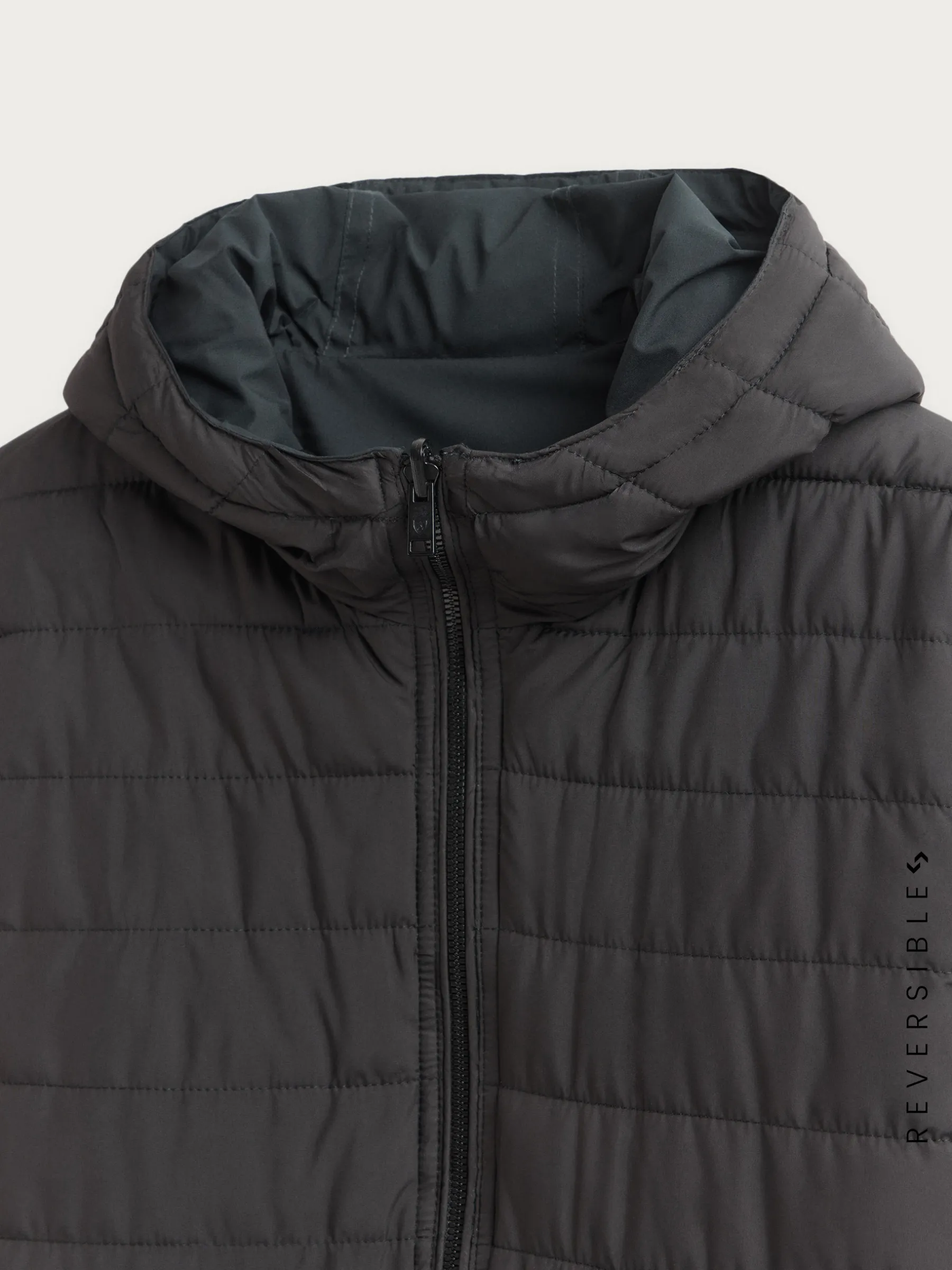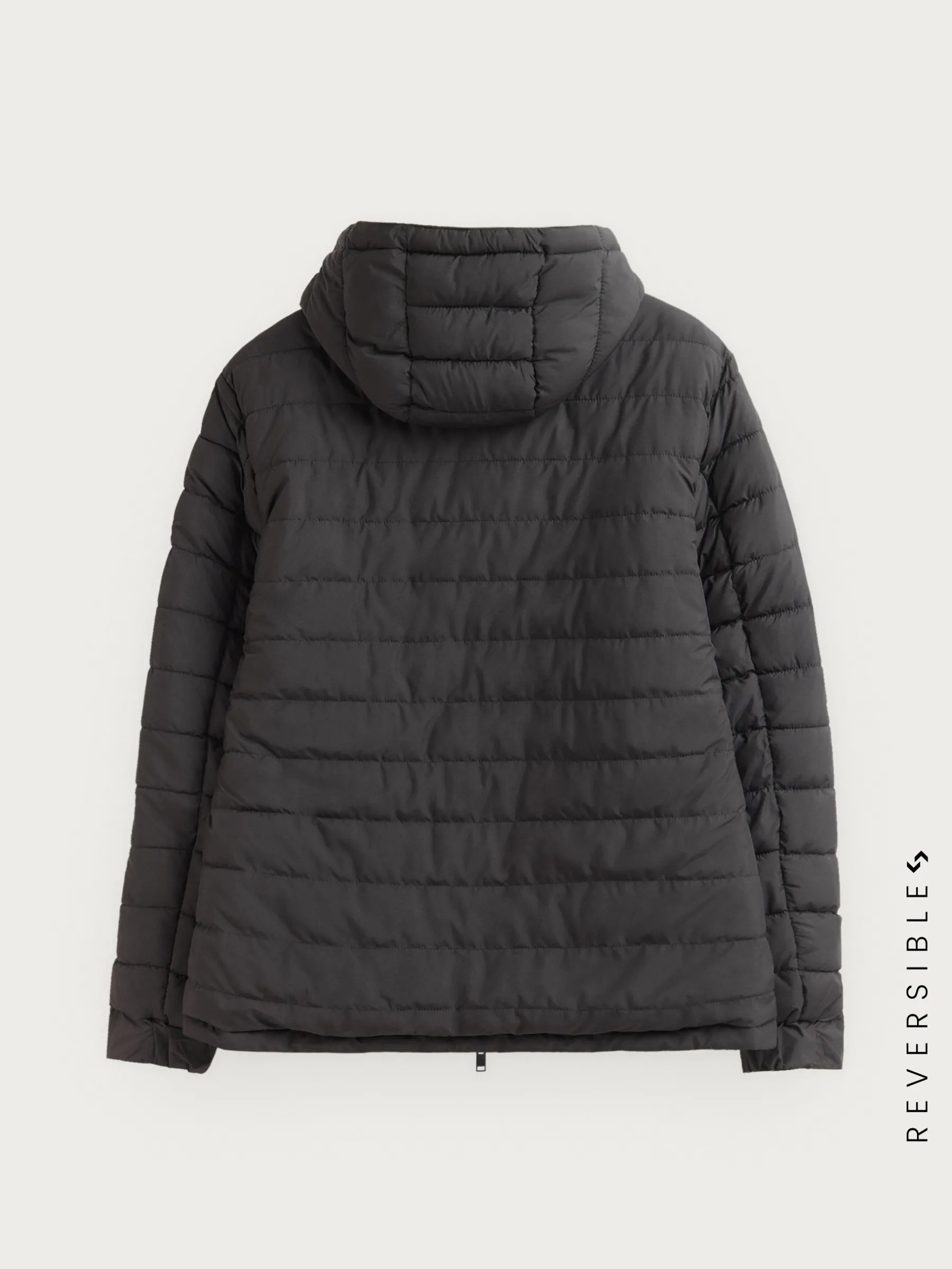Cazadora reversible acolchada con gorro ajustable. Cierre central mediante cremallera, dos bolsillos en el frontal de ambos lados y manga larga con puños ajustables. Detalle personalizado en una de las mangas.