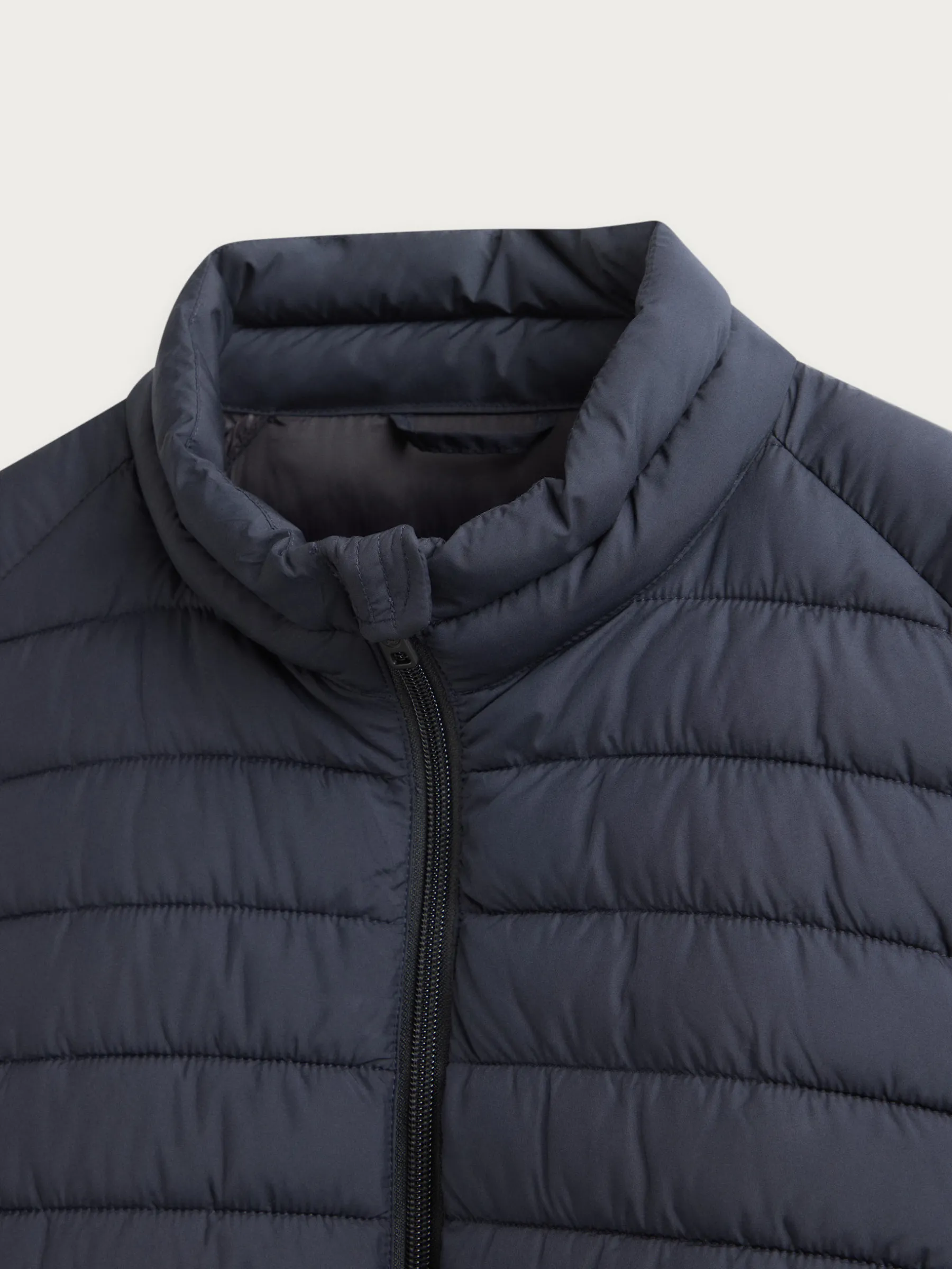 Cazadora acolchada con cuello subido, cierre central mediante doble cremallera, manga larga con puños elásticos y dos bolsillos en la cintura con cierre mediante cremallera. Detalle personalizado en una de sus mangas.