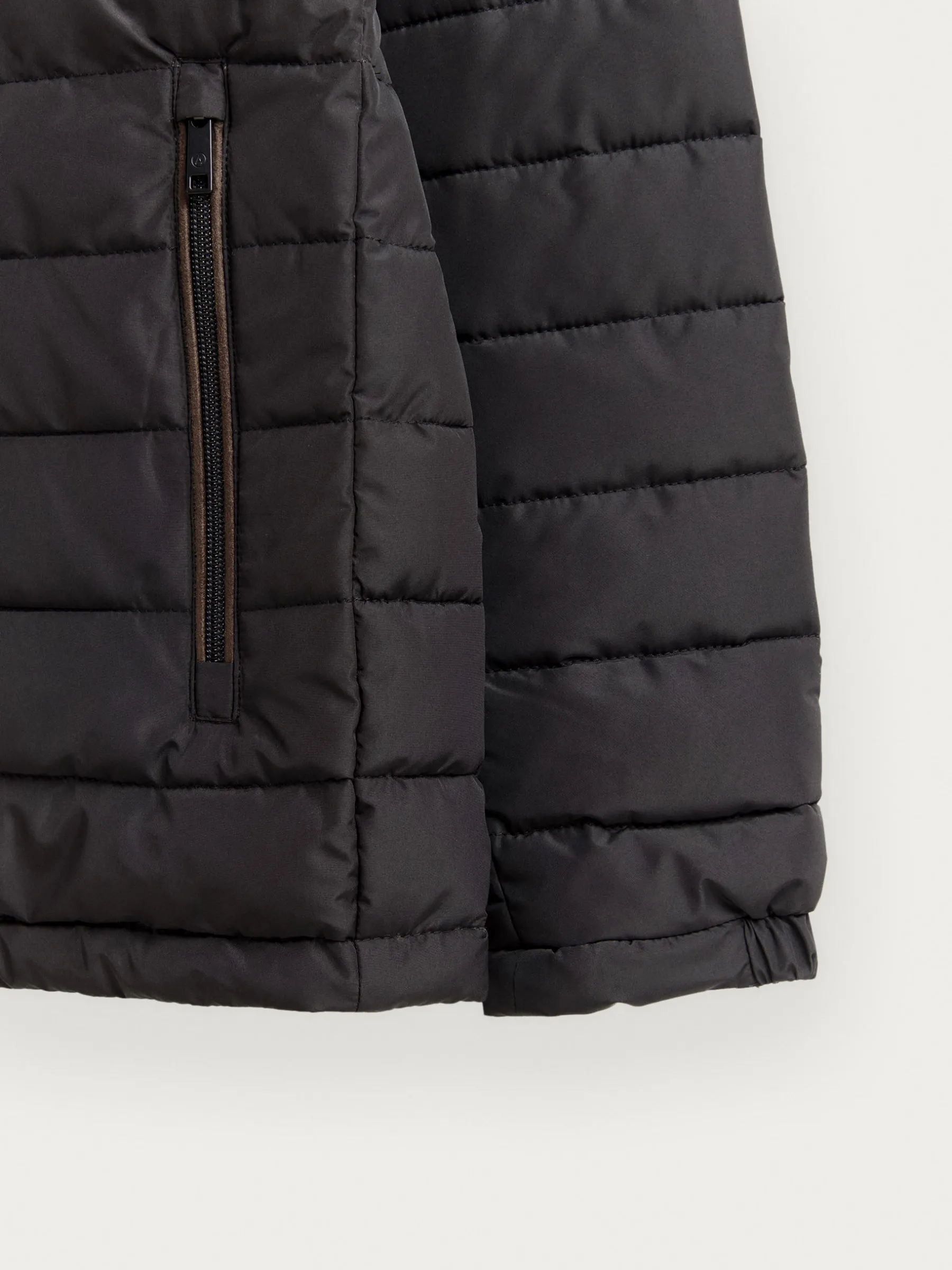 Cazadora acolchada con cuello subido y cremallera alrededor como detalle. Cierre central de cremallera, dos bolsillos en la cintura y logo grabado en el frontal. Interior forrado y viveado con bolsillo.
