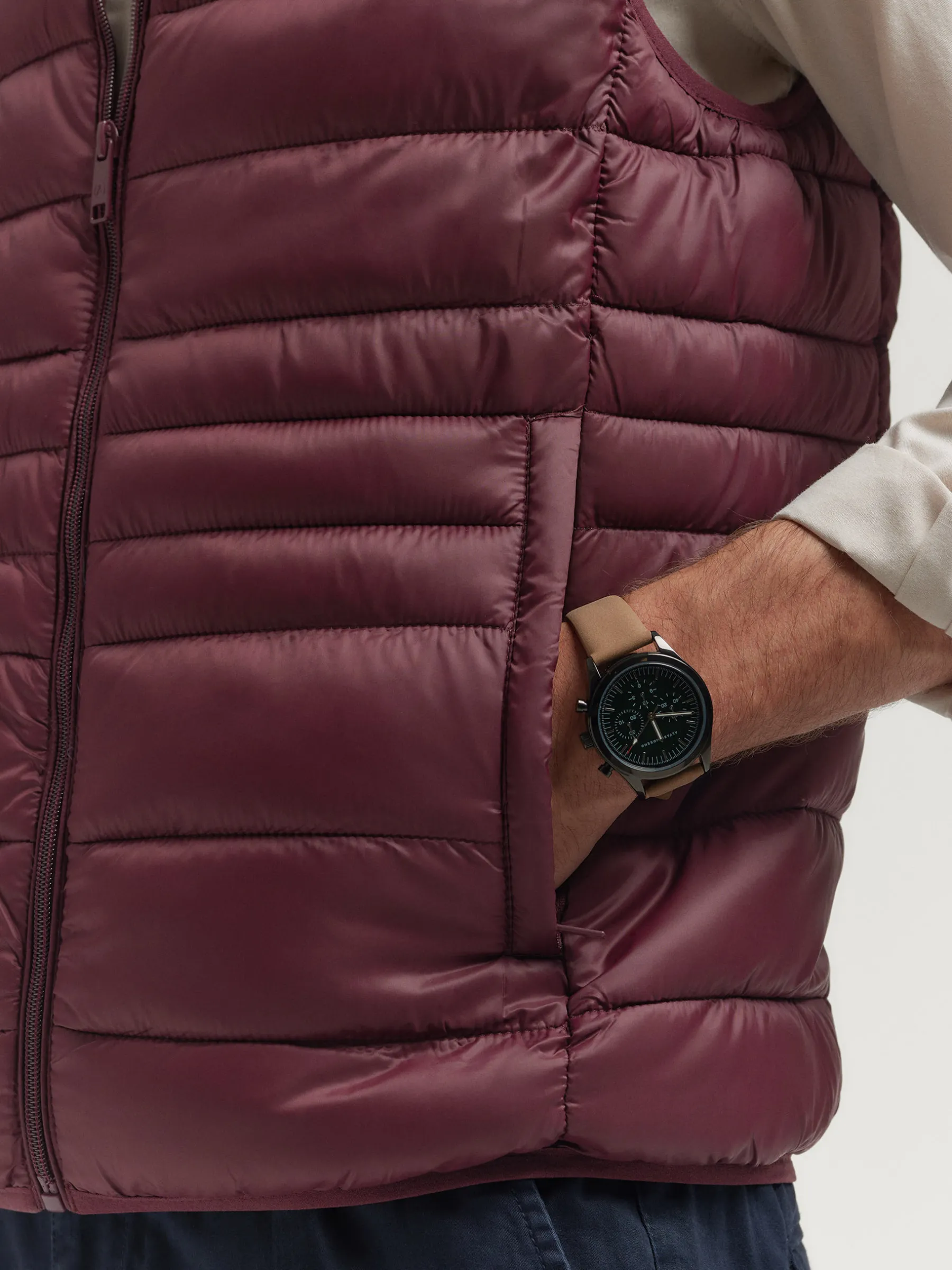 Chaleco acolchado con cuello subido. Dos bolsillo a la altura de la cintura, logo grabado en el frontal y sisa y cintura en punto elástico. Forro interior a contraste con bolsillos.