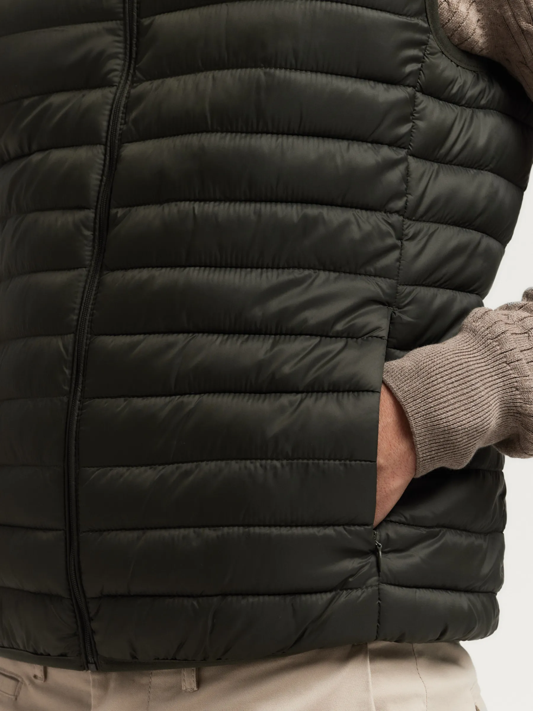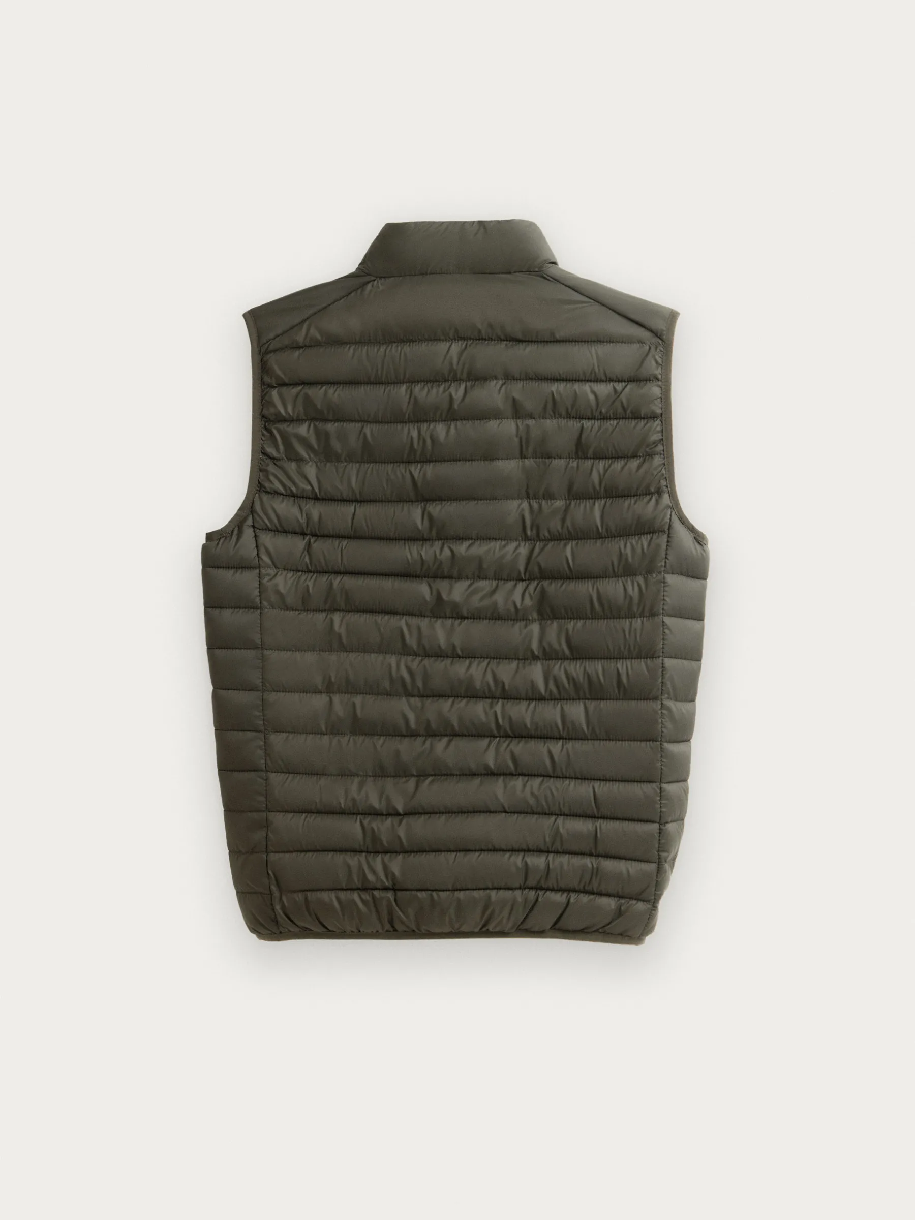 Chaleco acolchado con cuello subido y cierre central mediante cremallera, dos bolsillos a la altura de la cintura y logo de la marca grabado en el pecho. Elástico en la sisa y cintura. Forro interior a contraste con bolsillos.