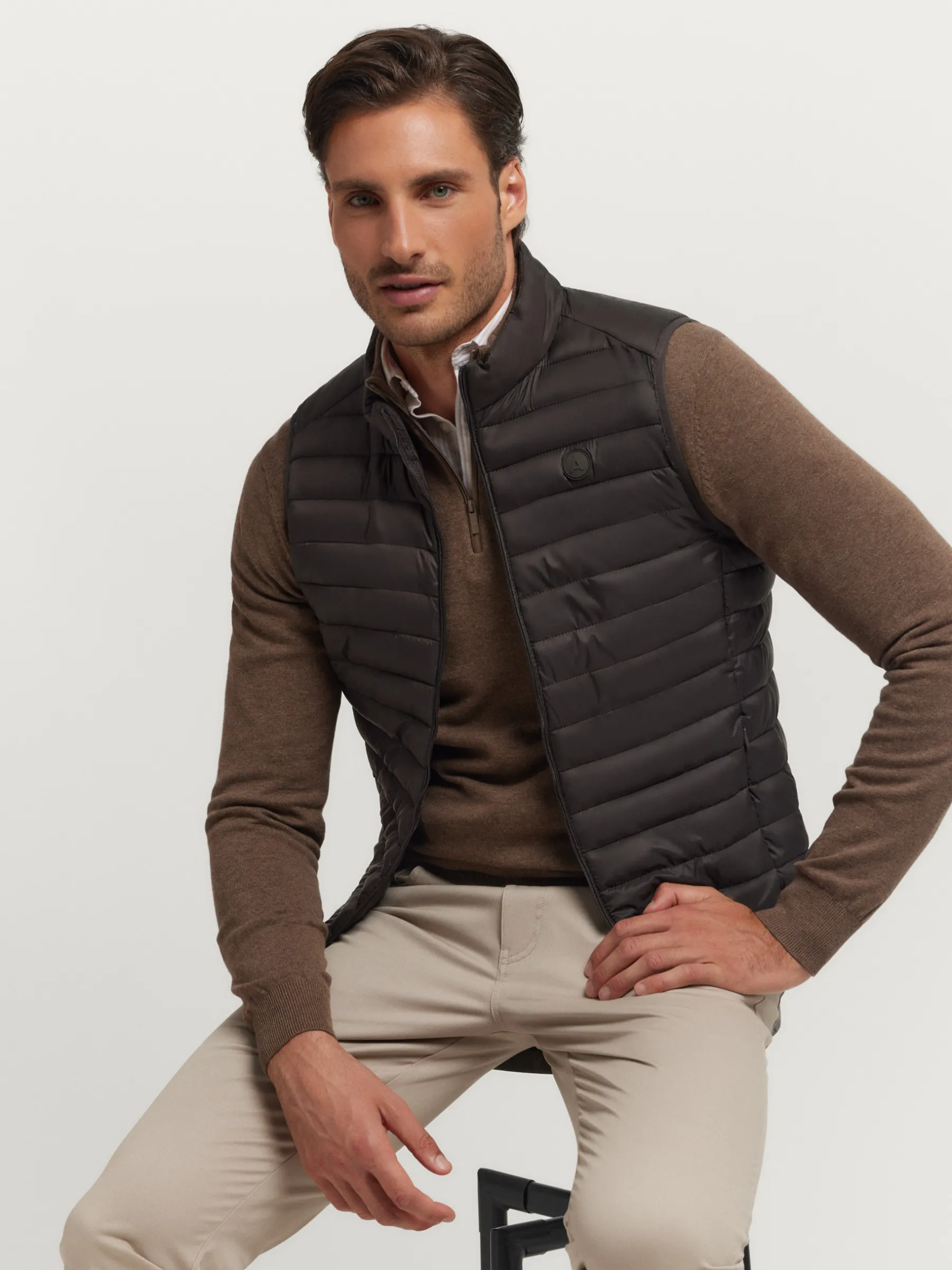 Chaleco acolchado con cuello subido y cierre central mediante cremallera, dos bolsillos a la altura de la cintura y logo de la marca grabado en el pecho. Elástico en la sisa y cintura. Forro interior a contraste con bolsillos.