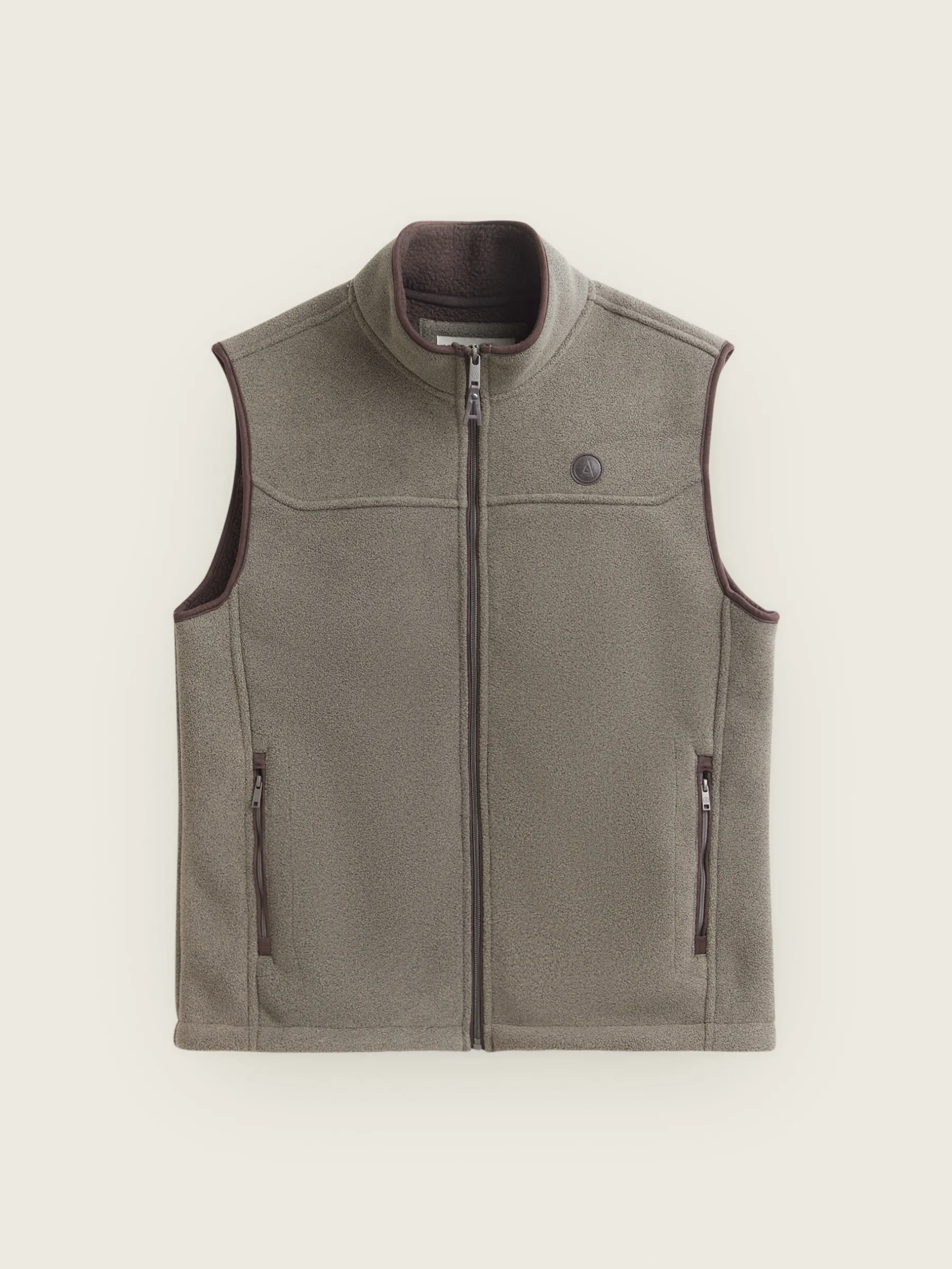 Chaleco confeccionado en tejido avivado en antelina en su exterior y forrado en su interior en borreguillo. Cuenta con cierre central mediante cremallera personalizada, dos bolsillos en su exterior y logo grabado en su frontal. Corte regular fit.