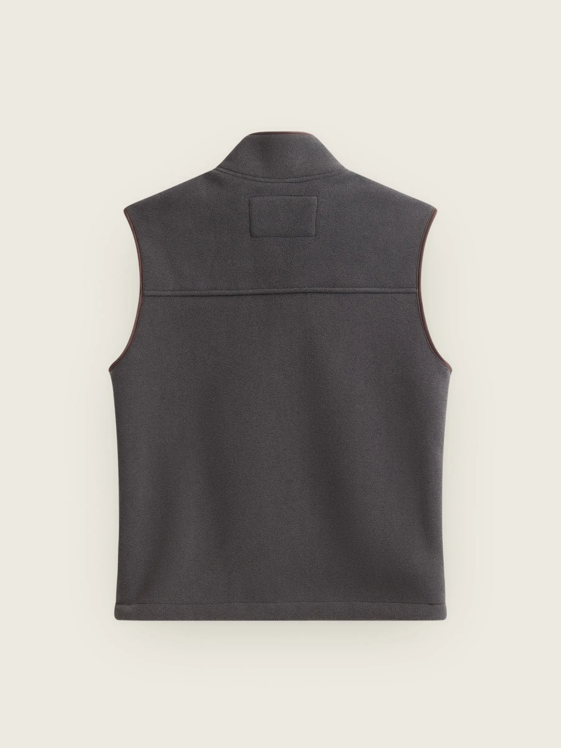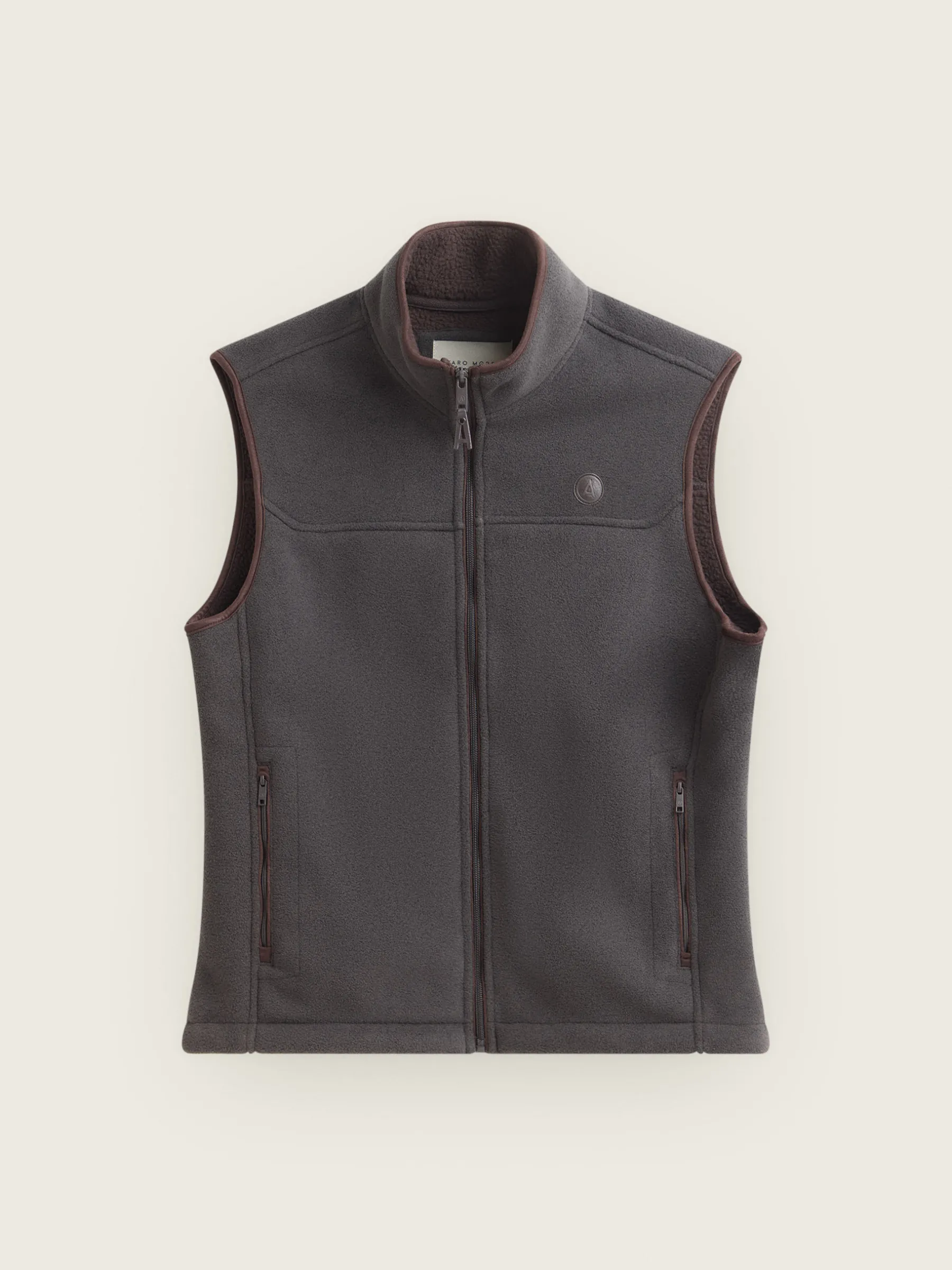 Chaleco confeccionado en tejido avivado en antelina en su exterior y forrado en su interior en borreguillo. Cuenta con cierre central mediante cremallera personalizada, dos bolsillos en su exterior y logo grabado en su frontal. Corte regular fit.