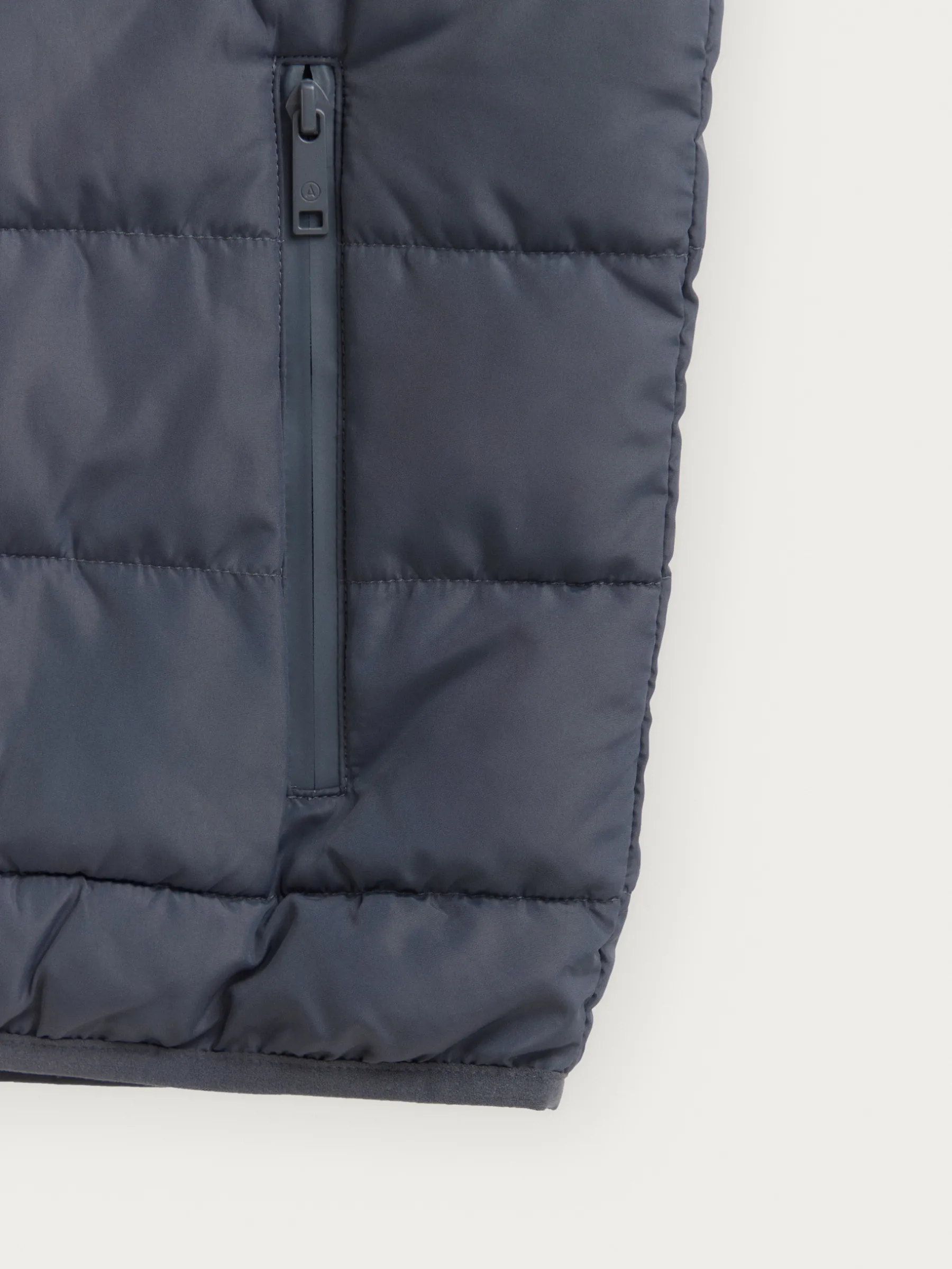 Chaleco acolchado con cuello subido y cierre central mediante doble cremallera, dos bolsillos a la altura de la cintura con cierre de cremallera y logo de la marca grabado en el frontal al tono. Elástico en la sisa y cintura. Cremalleras termoselladas. Interior con dos bolsillos y doble compartimento cada uno.