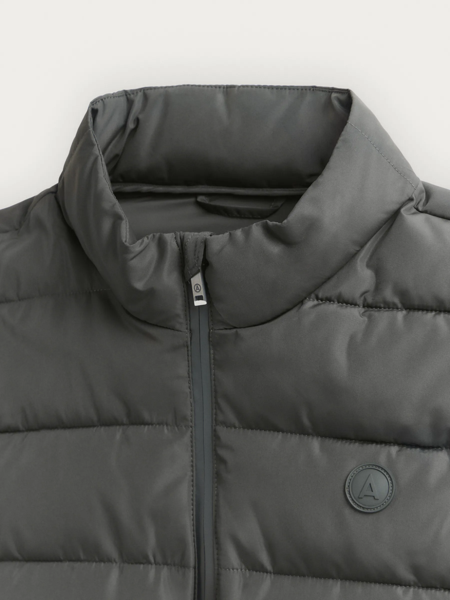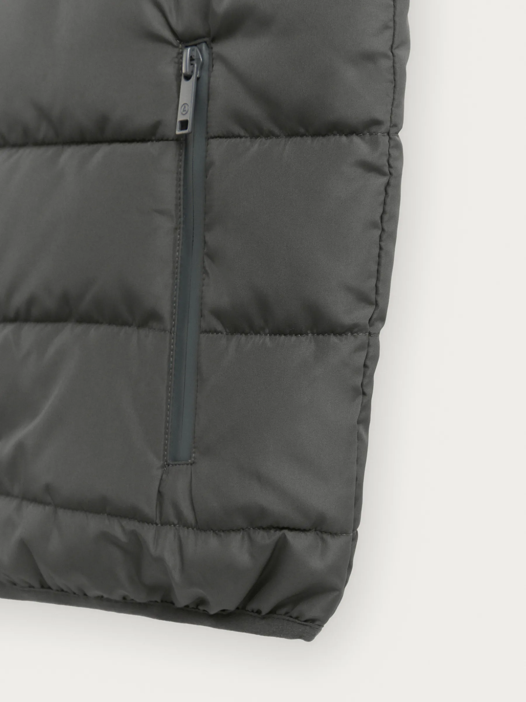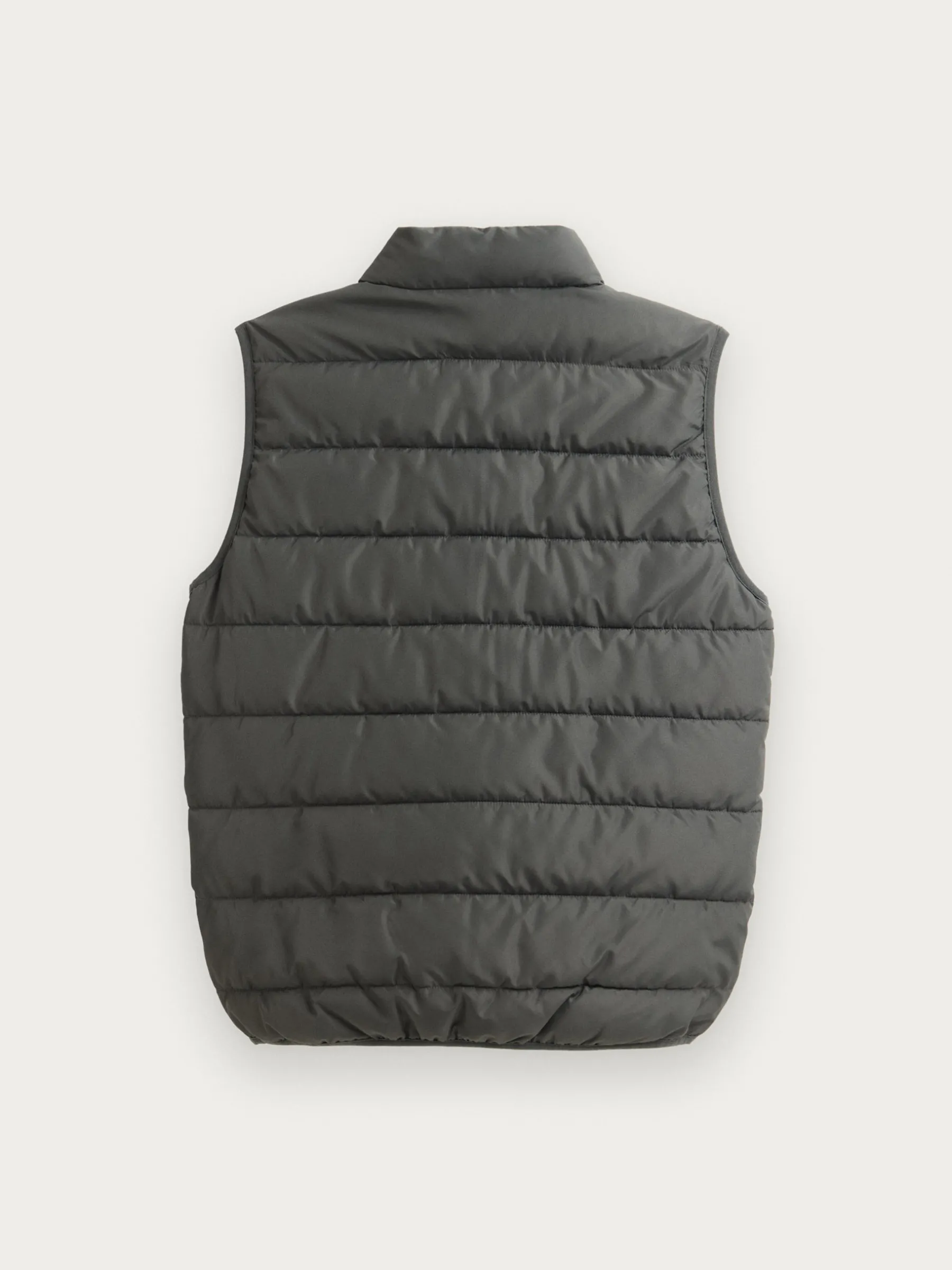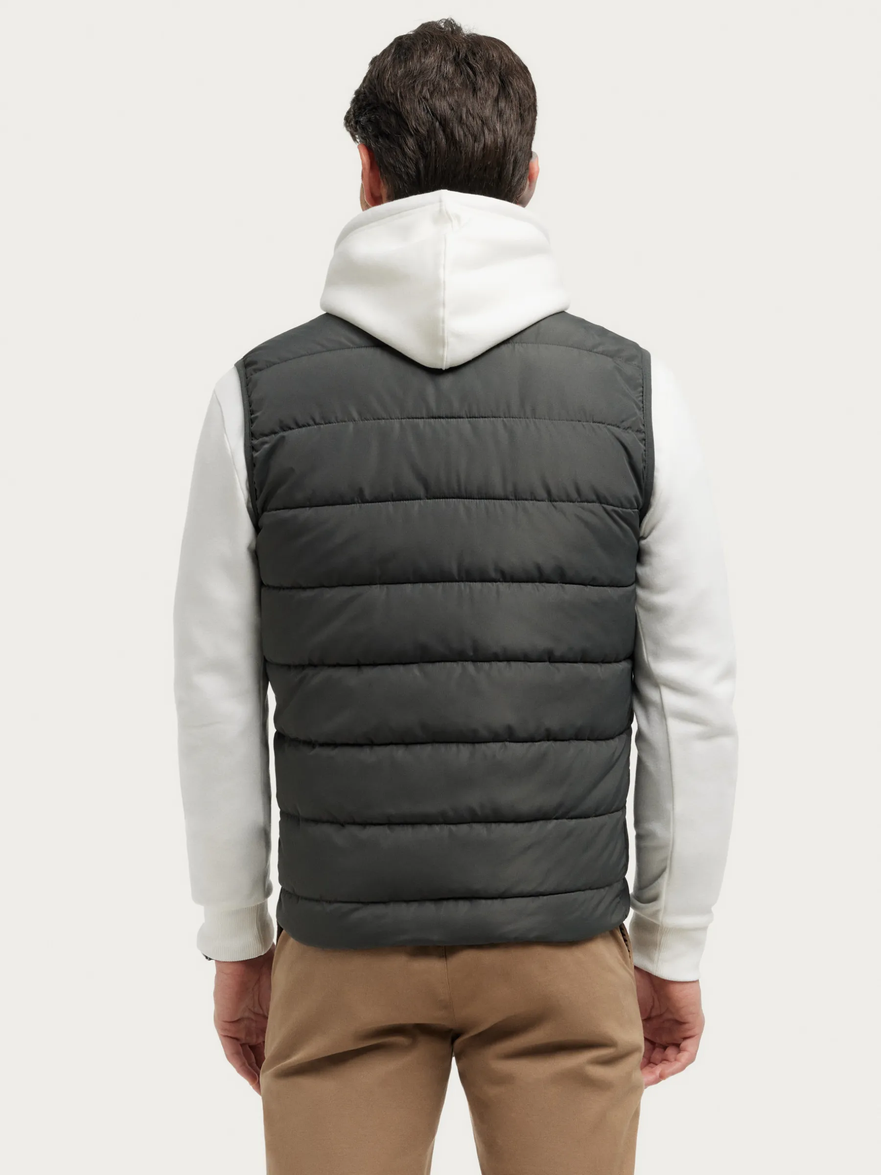 Chaleco acolchado con cuello subido y cierre central mediante doble cremallera, dos bolsillos a la altura de la cintura con cierre de cremallera y logo de la marca grabado en el frontal al tono. Elástico en la sisa y cintura. Cremalleras termoselladas. Interior con dos bolsillos y doble compartimento cada uno.