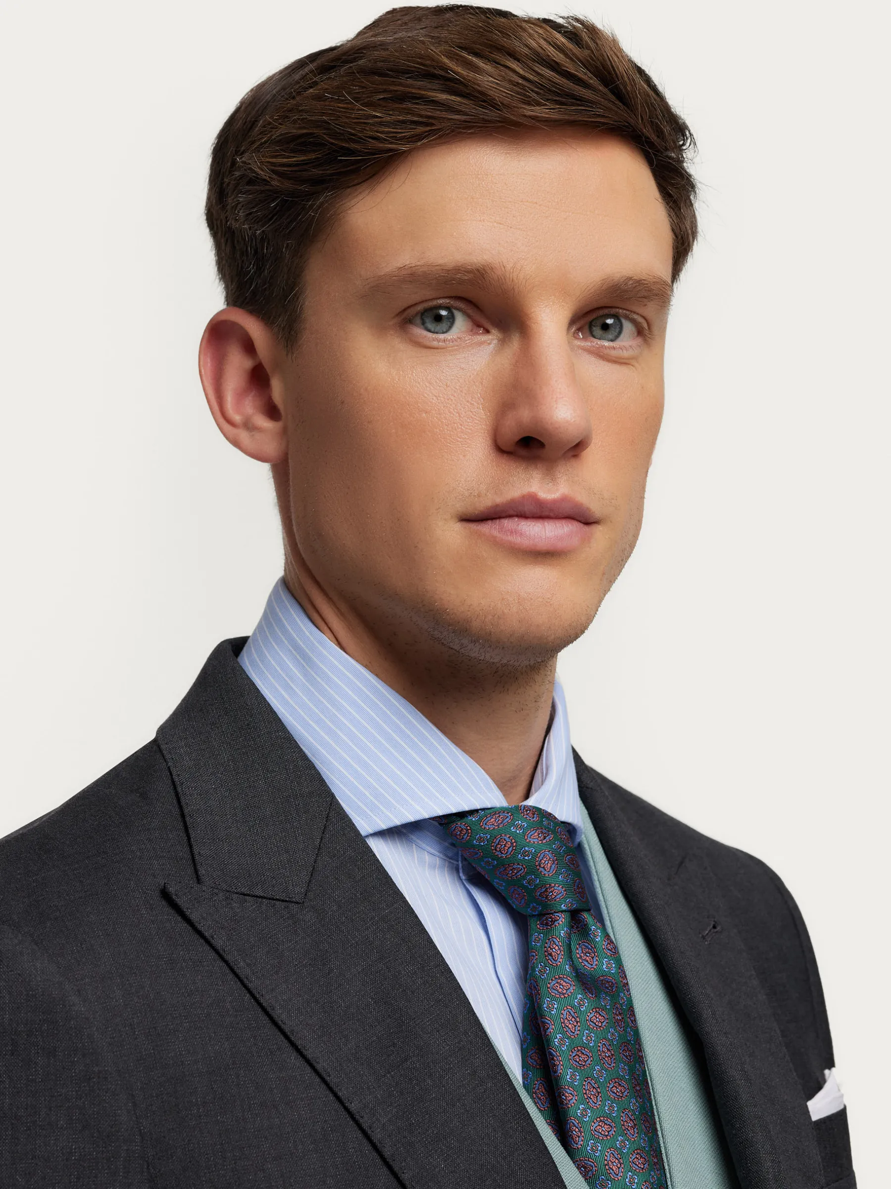 Levita clásico de un conjunto de dos piezas. Cuenta con cuello y solapa, cierre central mediante botonadura, bolsillo de ojal en el pecho, manga larga con botones en los puños, abertura en la espalda y forrada en su interior con bolsillos.