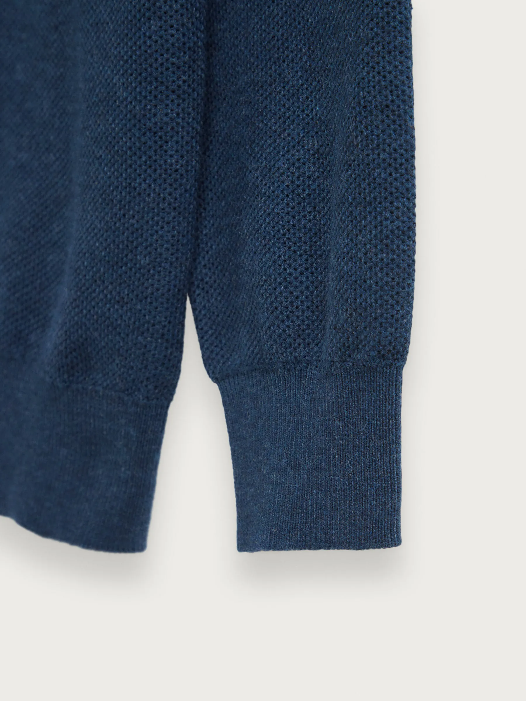 Jersey con tejido de estructura, cuello a la caja y logo de la marca bordado en el frontal al tono. Bajo, puños y cuello en acabado ribeteado de punto elástico para mayor comodidad. Corte regular fit.