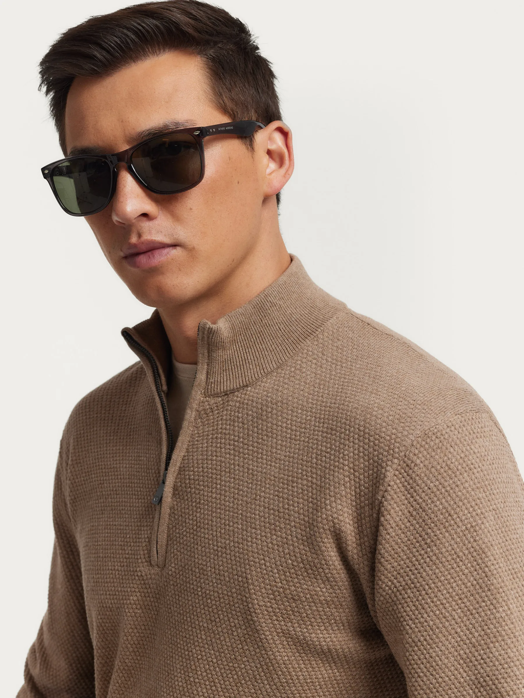 Jersey confeccionado en algodón con estructura en su tejido. Cuenta con cuello alto con medio cierre de cremallera y cuello, puños y bajo en acabado elástico. Corte regular fit.
