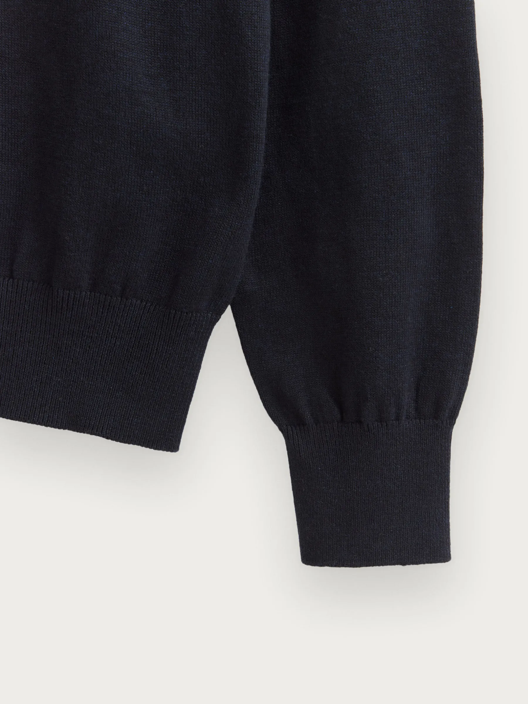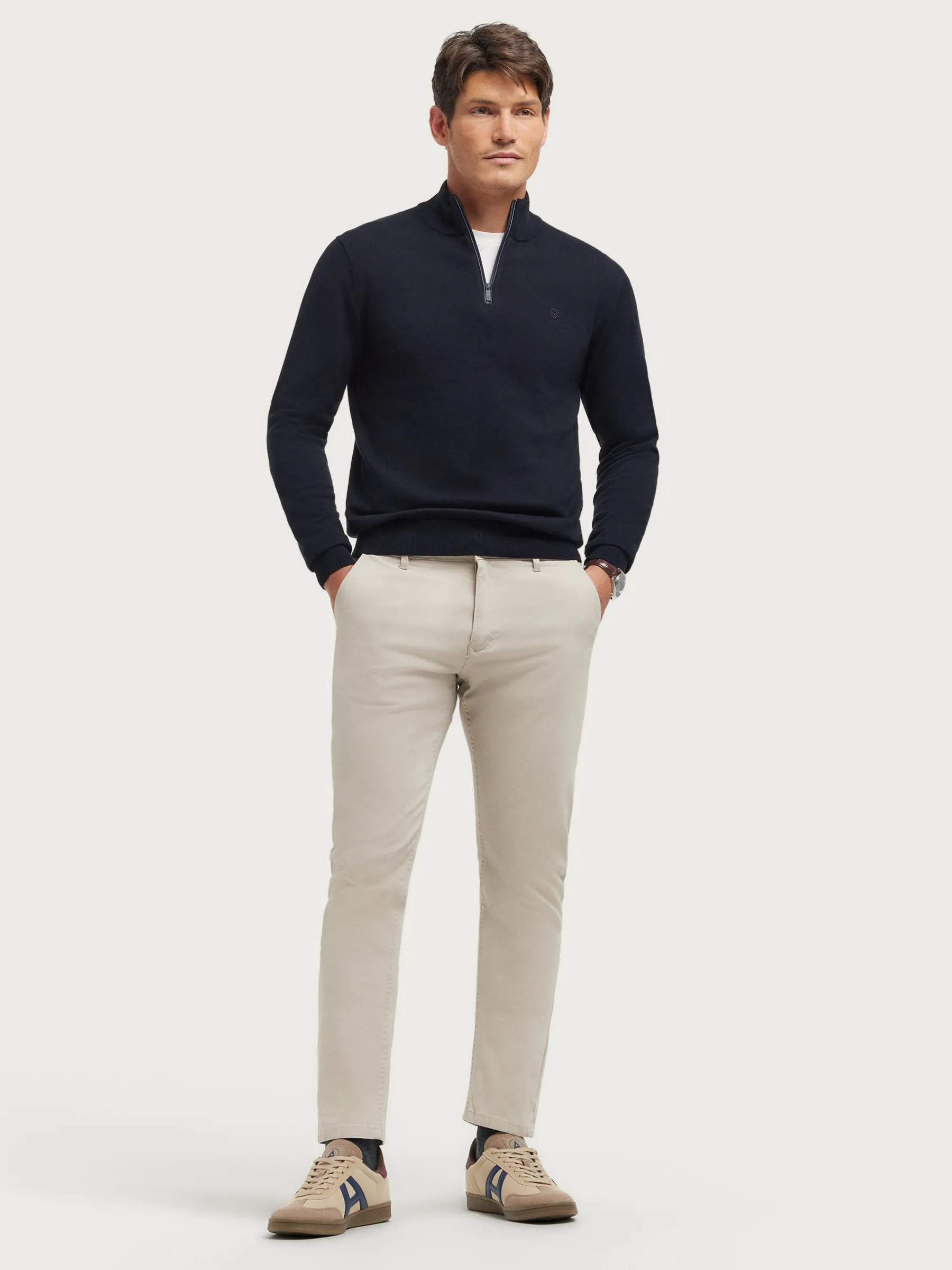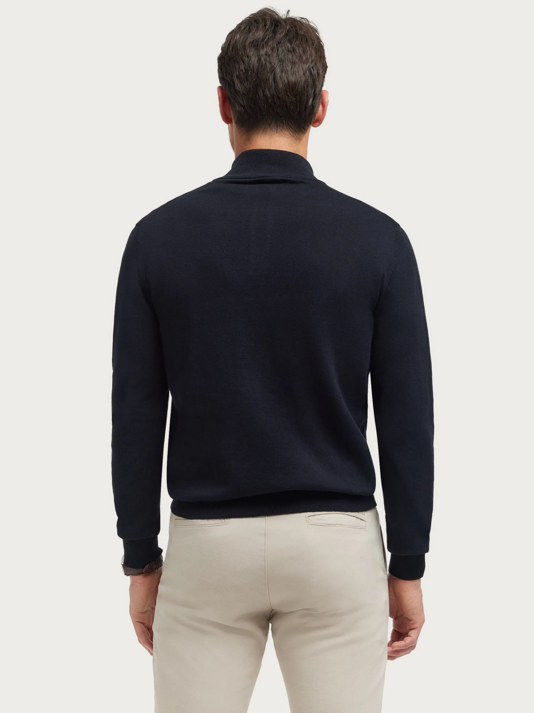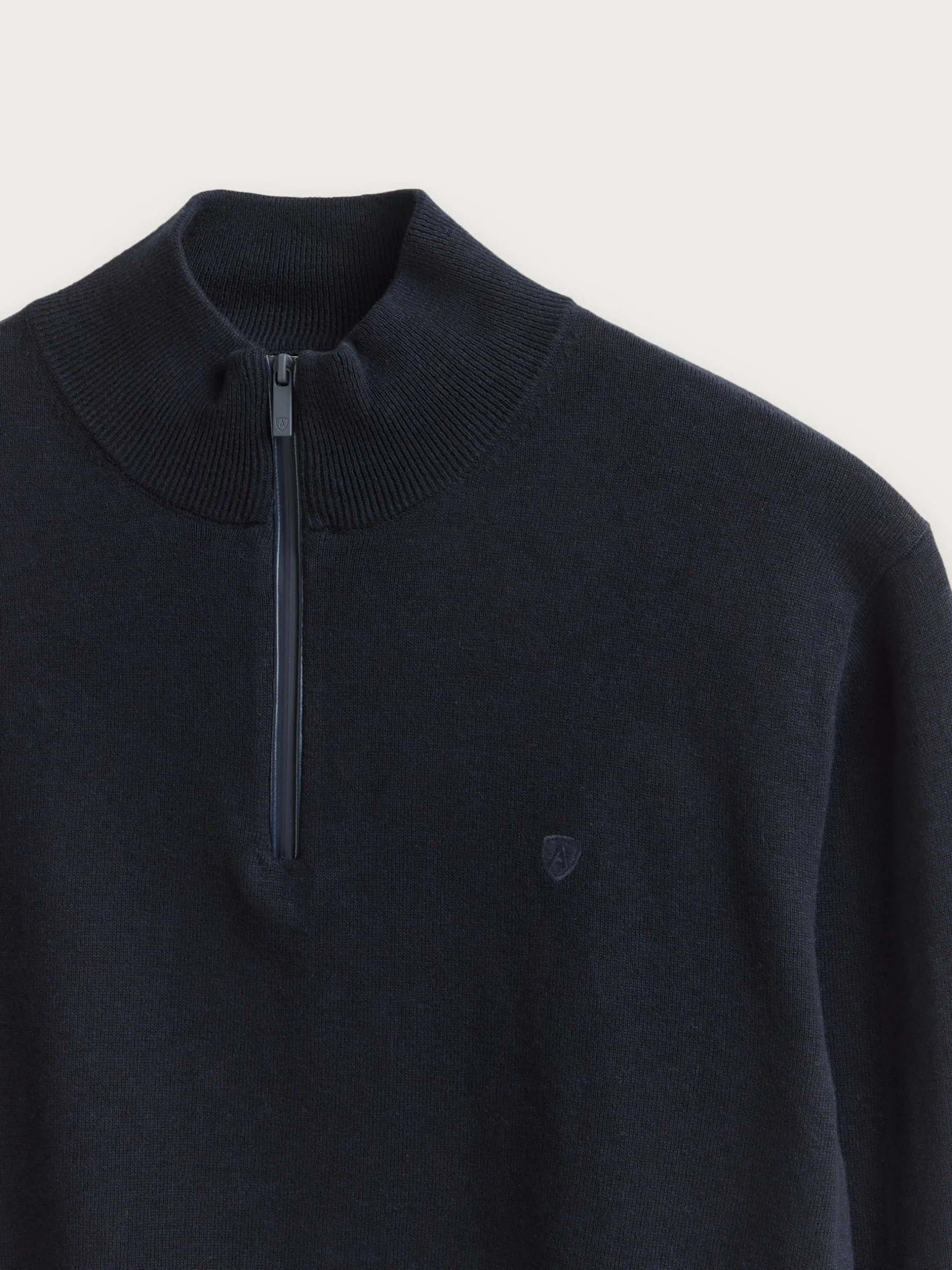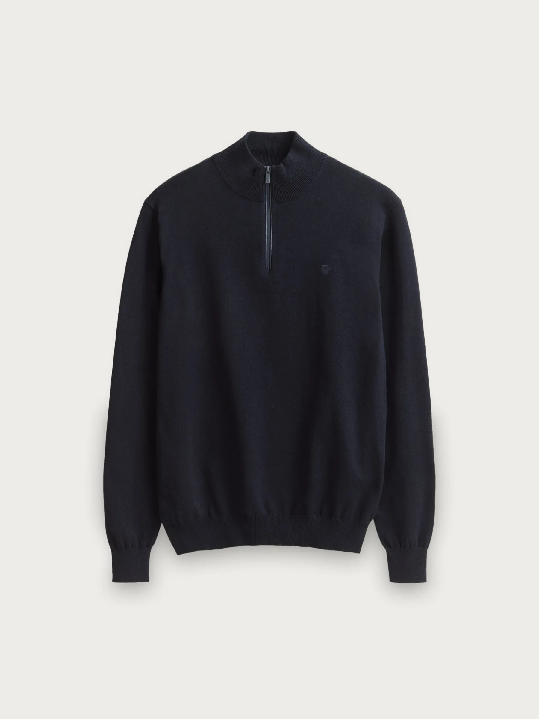 Jersey de corte regular confeccionado en algodón. Cuello alto con medio cierre de cremallera. Logo bordado en el frontal al tono. Cuello, puños y bajo en acabado elástico.