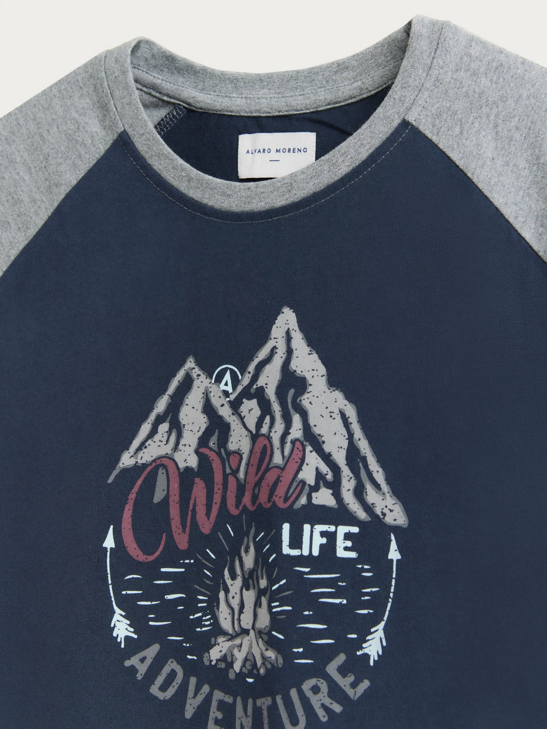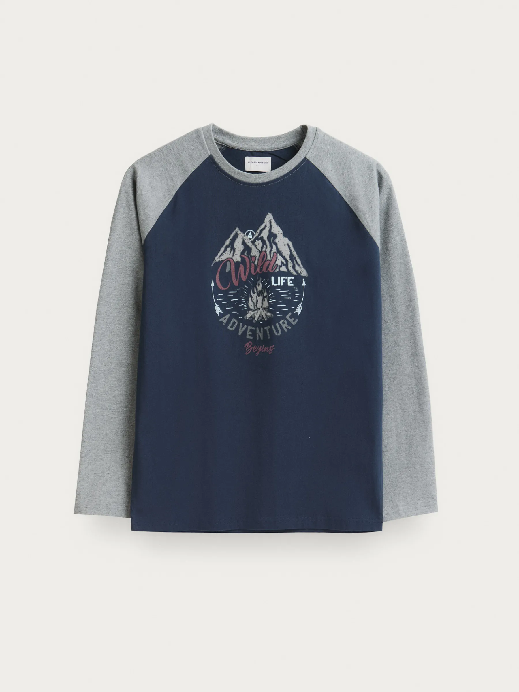 Pijama compuesto por dos piezas, superior e inferior. Parte superior camiseta de manga larga con cuello redondo y estampación personalizada en el frontal. Pantalón liso con cinturilla elástica y cordón ajustable.