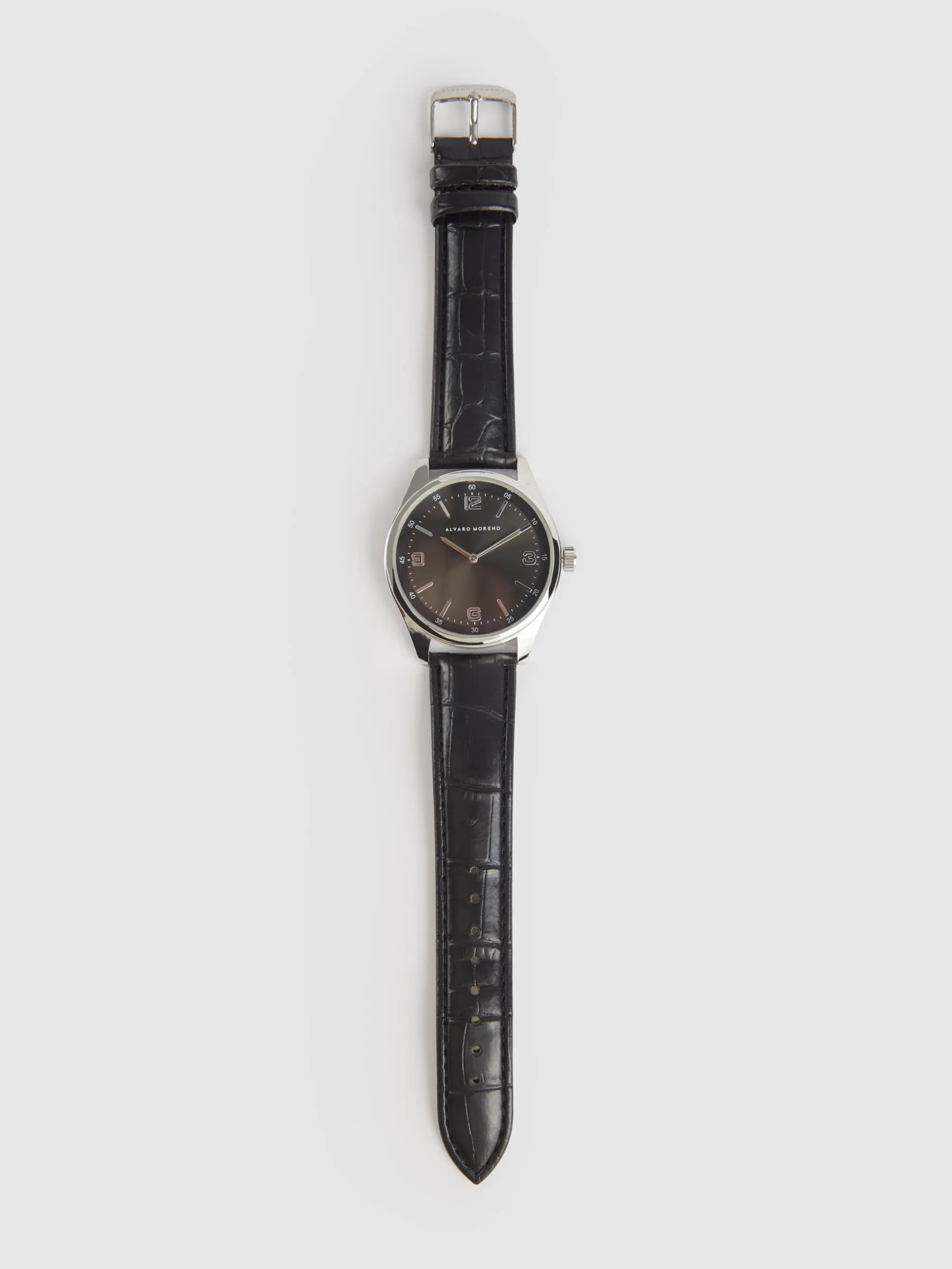 Reloj con movimiento de cuarzo japonés, esfera metalizada, detalle de logo grabado y tapa trasera en acero inoxidable. Correa en símil piel y cierre de hebilla metalizada con el logo de la marca grabado.