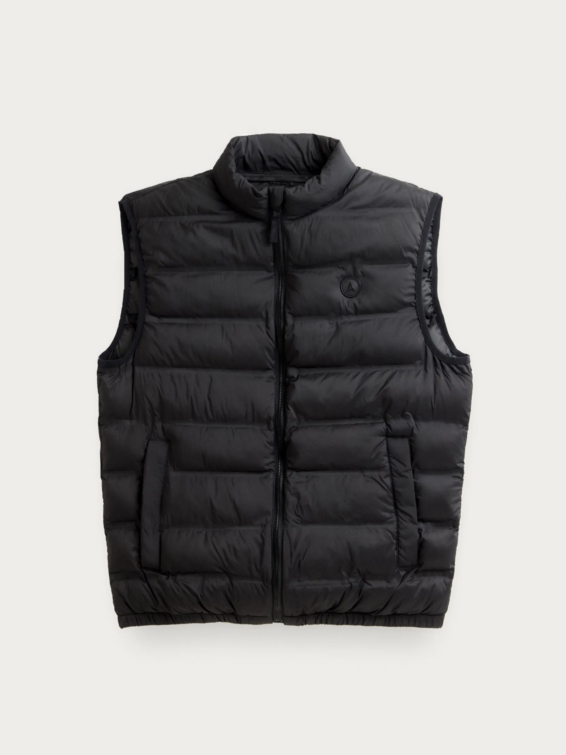 Chaleco acolchado con cuello subido y cierre central mediante cremallera, dos bolsillos a la altura de la cintura y logo de la marca grabado en el pecho al tono. Elástico en la sisa y cintura. Forro interior a contraste con bolsillos.