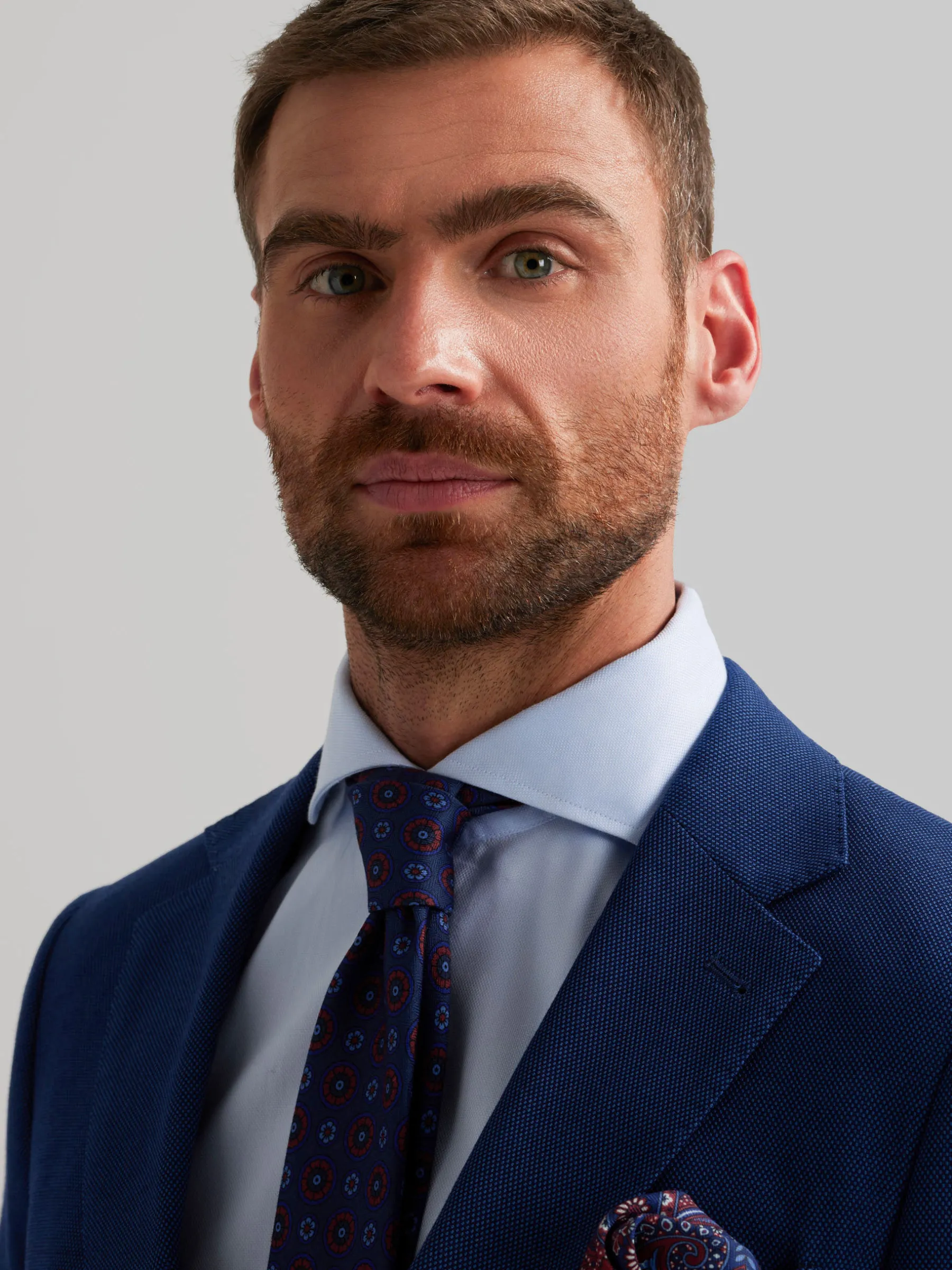 Americana con cuello y solapa en tejido de ojo de perdiz. Cierre central mediante botones, bolsillo de ojal en el pecho, tres bolsillos de solapa en la cintura y puños con botones decorativos. Interior forrado y con bolsillos.