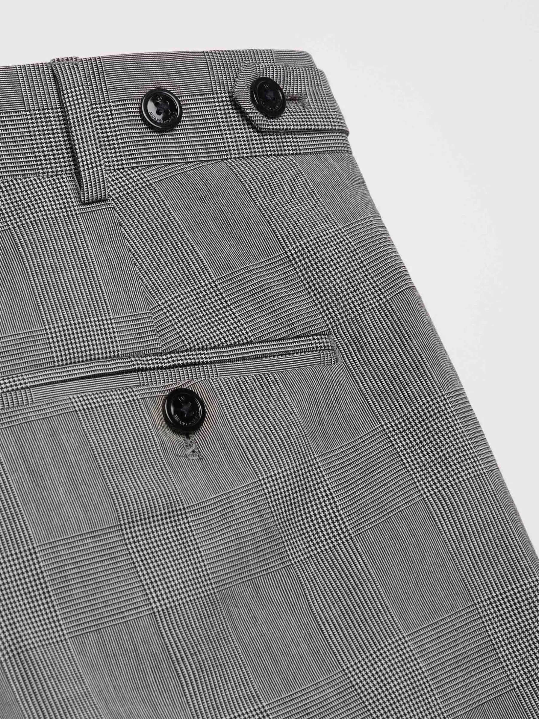 Pantalón de traje en tejido a cuadros que cuenta con cierre frontal con prolonga de botón desplazado y cremallera, dos bolsillos en el frontal y un bolsillo con cierre de botón en la parte trasera. Bajo con vuelta y detalle ajustable en la cintura. Forrado en su interior.
