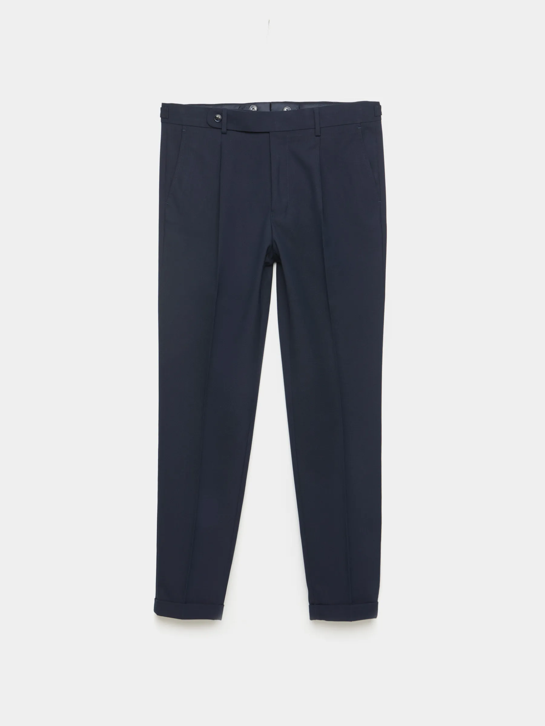 Pantalón de traje que cuenta con la cintura más alta, pinzas en el frontal y cierre mediante cremallera y botones con una pletina prolongada. Dos bolsillos en la parte delantera, dos bolsillos traseros con cierre mediante botón y bajo que termina con una vuelta. Presenta en la cinturilla un ajustador con botones. Forrado en su interior con botones para tirantes.