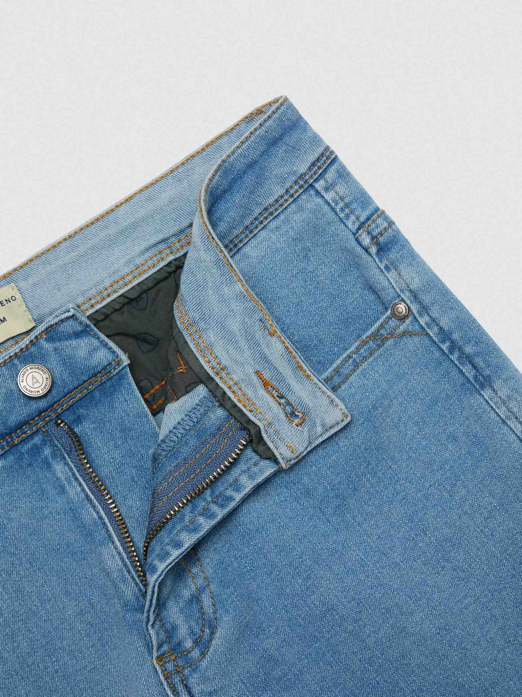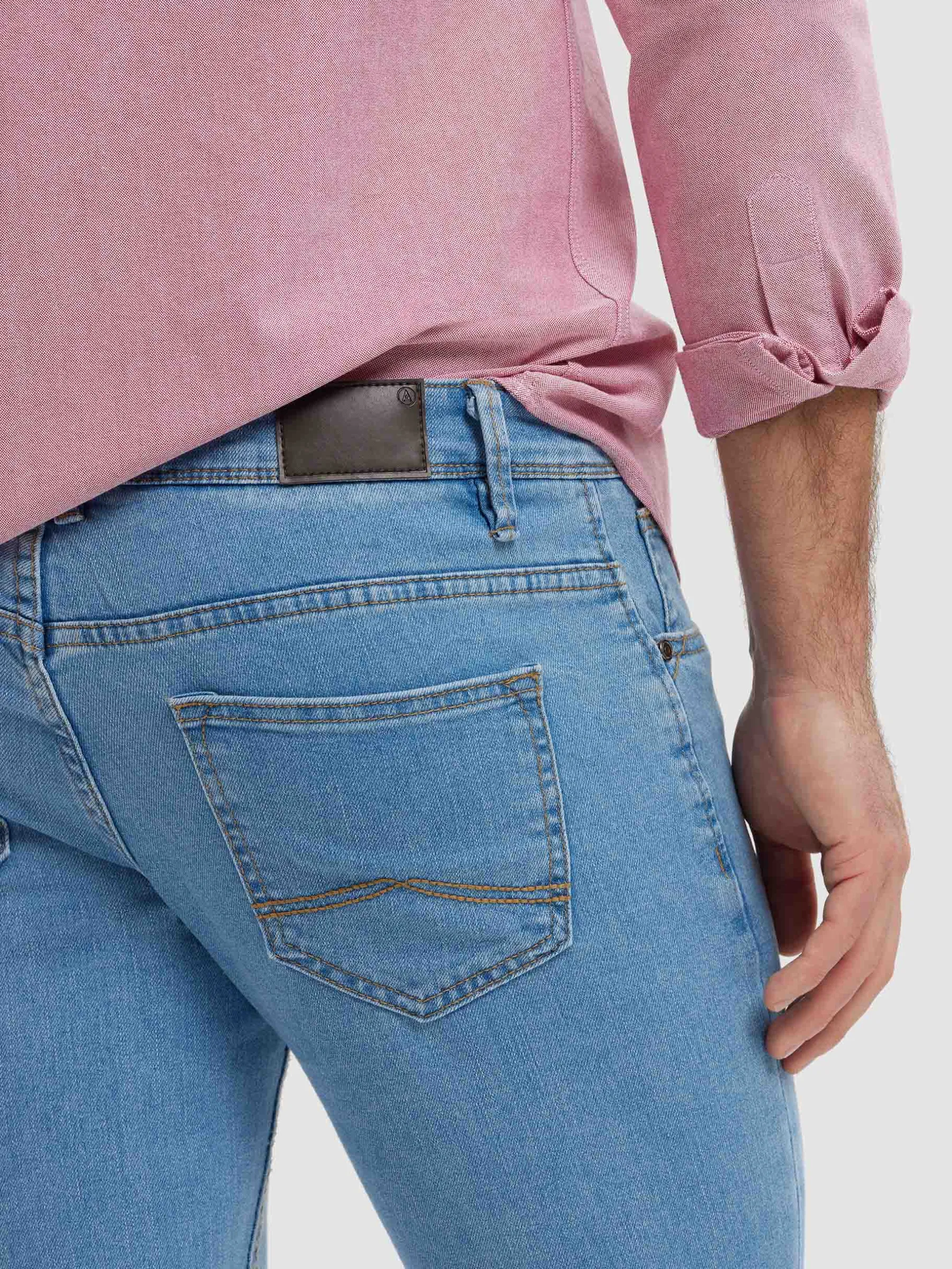 Pantalón denim de corte slim fit con cinco bolsillos y cierre central mediante botón y cremallera, pespuntes en color camel, fornituras personalizadas y etiqueta en efecto piel en la cinturilla.