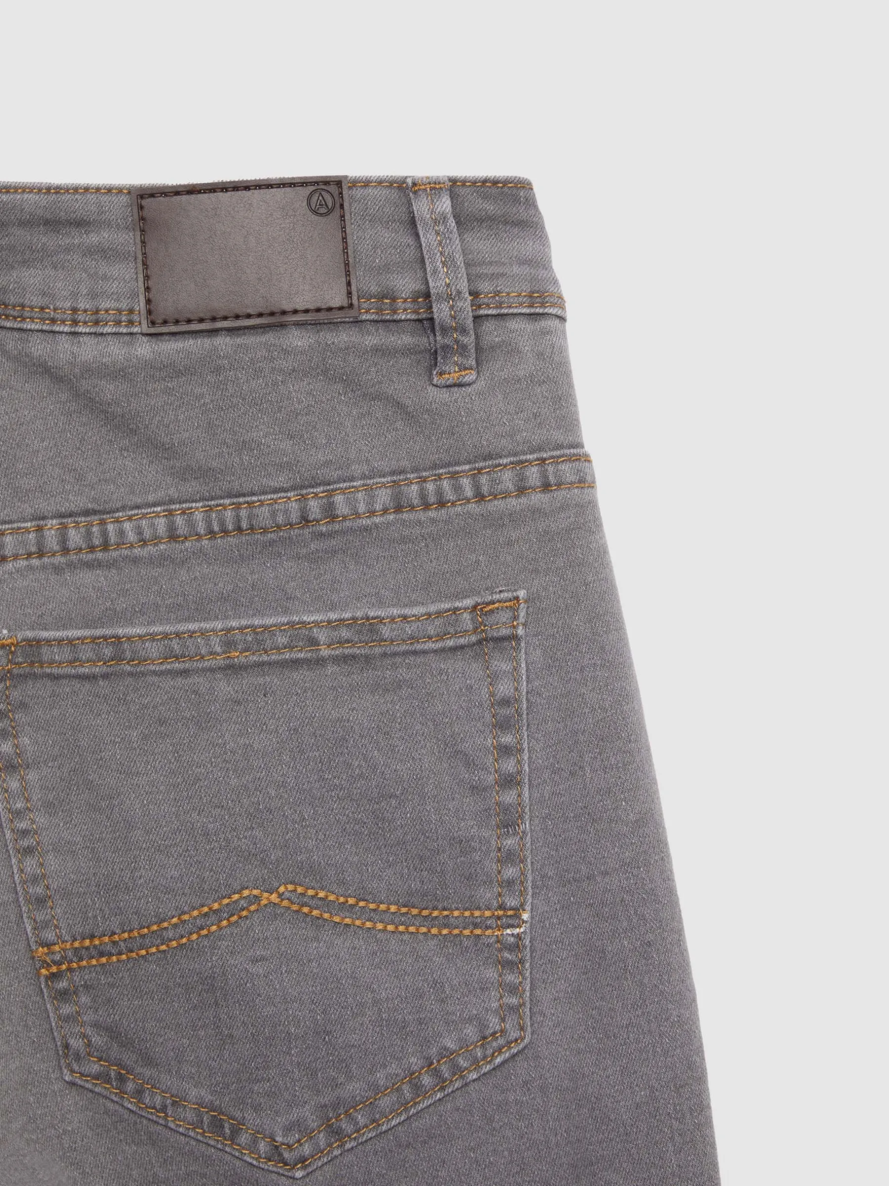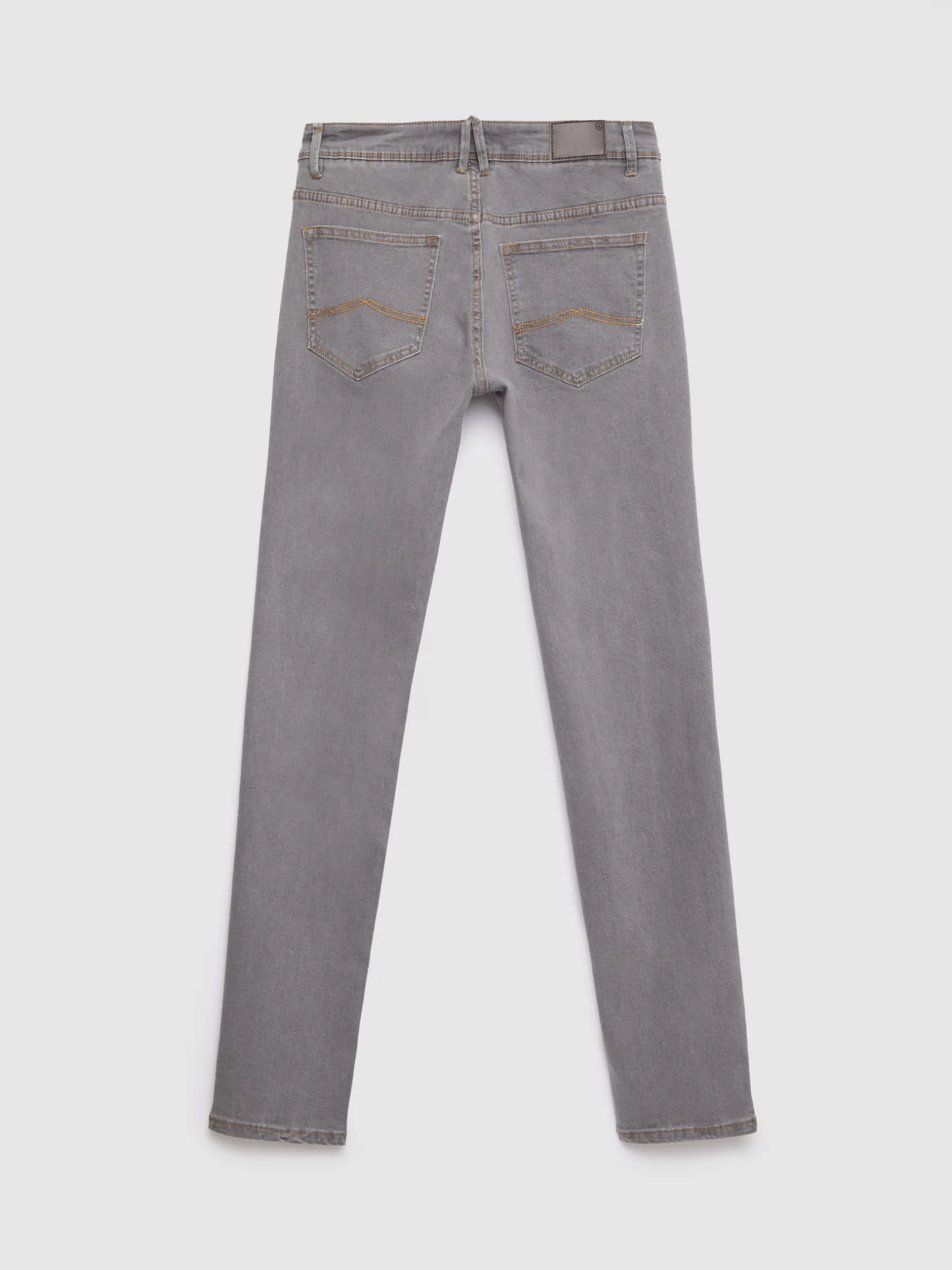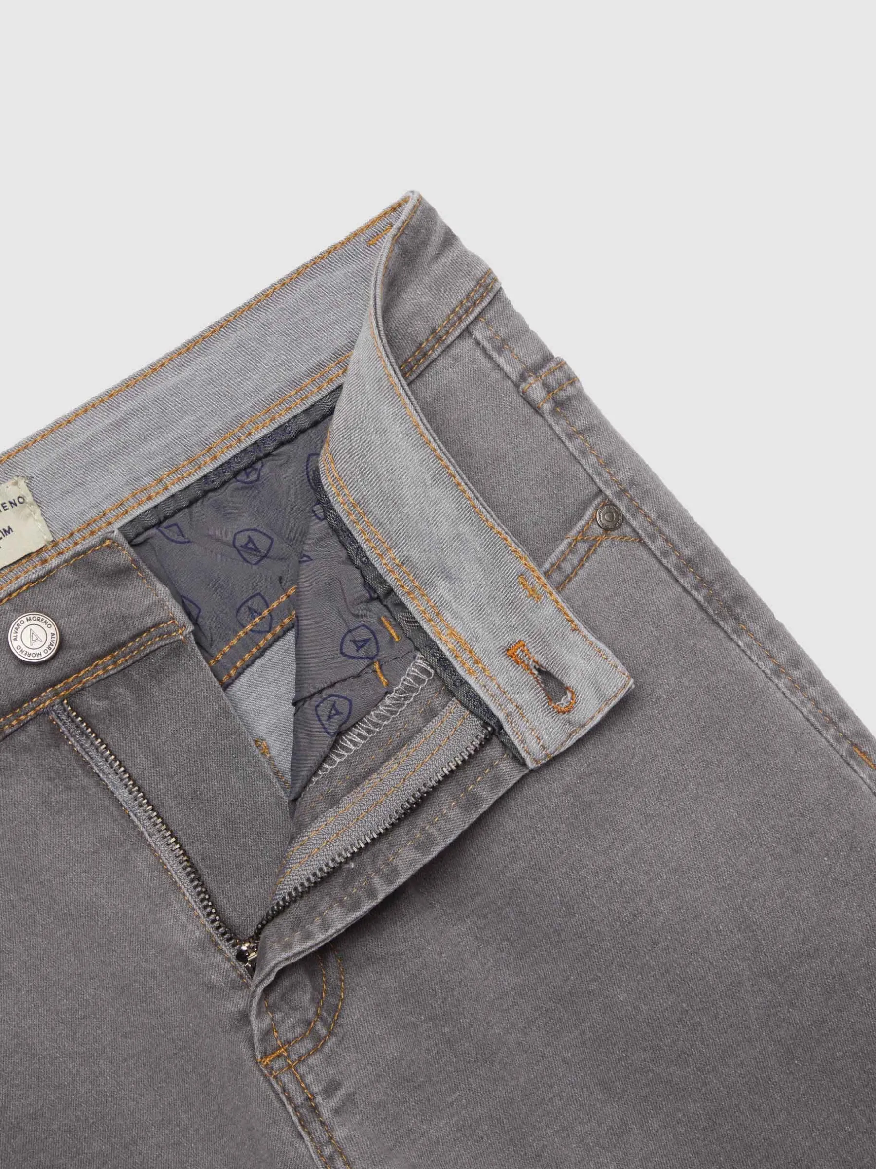 Pantalón denim de corte slim fit con cinco bolsillos y cierre central mediante botón y cremallera, pespuntes en color camel, fornituras personalizadas y etiqueta en efecto piel en la cinturilla.
