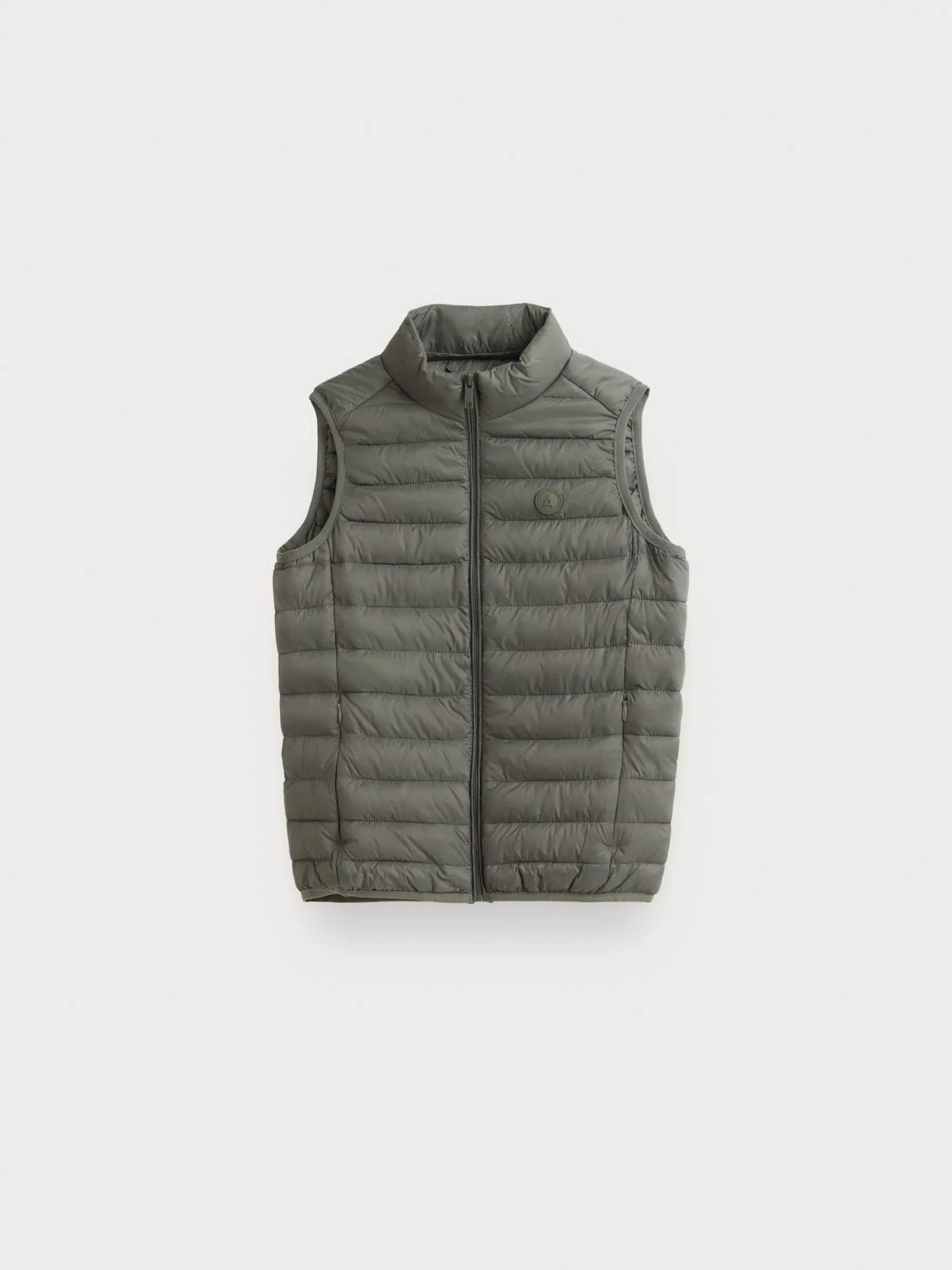 Chaleco acolchado con cuello subido y cierre central mediante cremallera, dos bolsillos a la altura de la cintura y logo de la marca grabado en el pecho. Elástico en la sisa y cintura. Forro interior a contraste con bolsillos.