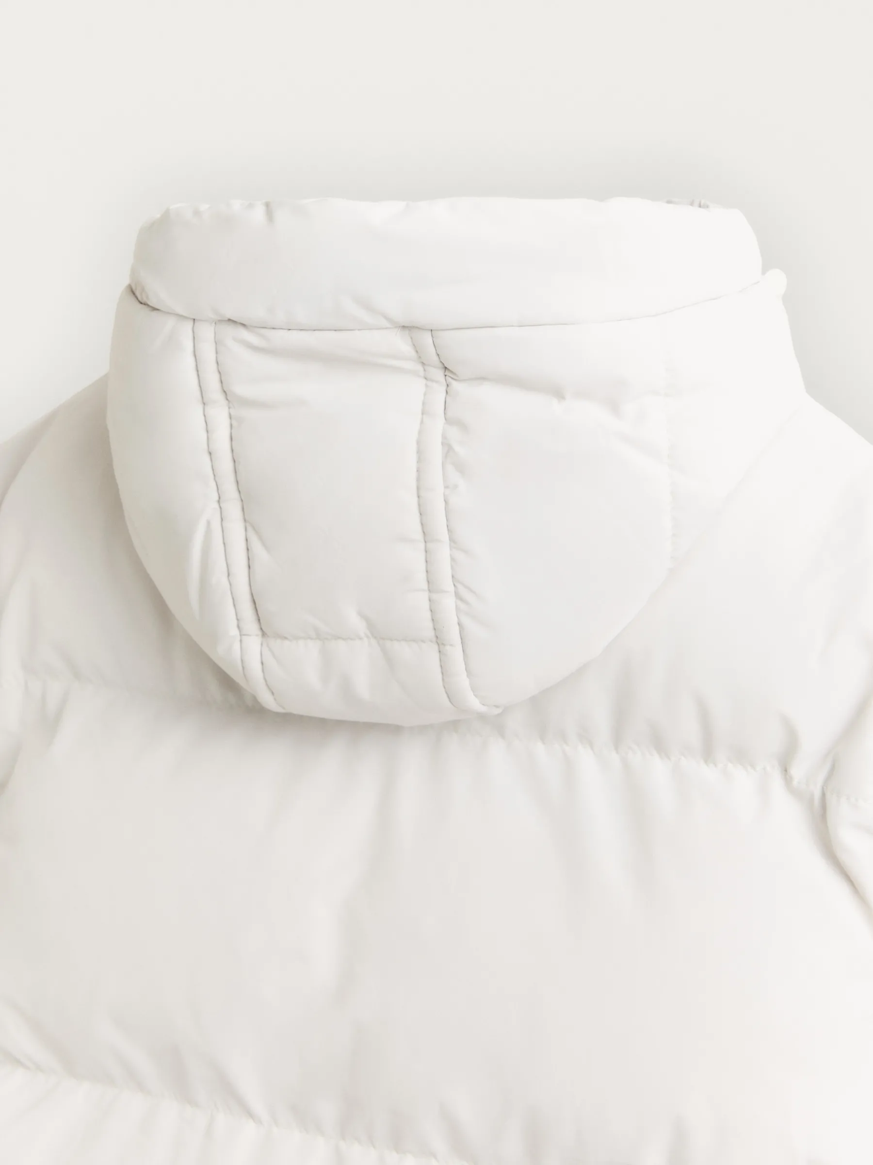 Parka acolchada con cuello subido y gorro ajustable. Cierre central mediante cremallera, dos bolsillos en la cintura con cierre de cremallera y manga larga con doble puño en punto elástico. Detalle personalizado engomado en una de sus mangas. Interior con bolsillo y forrado. Cremalleras termoselladas.