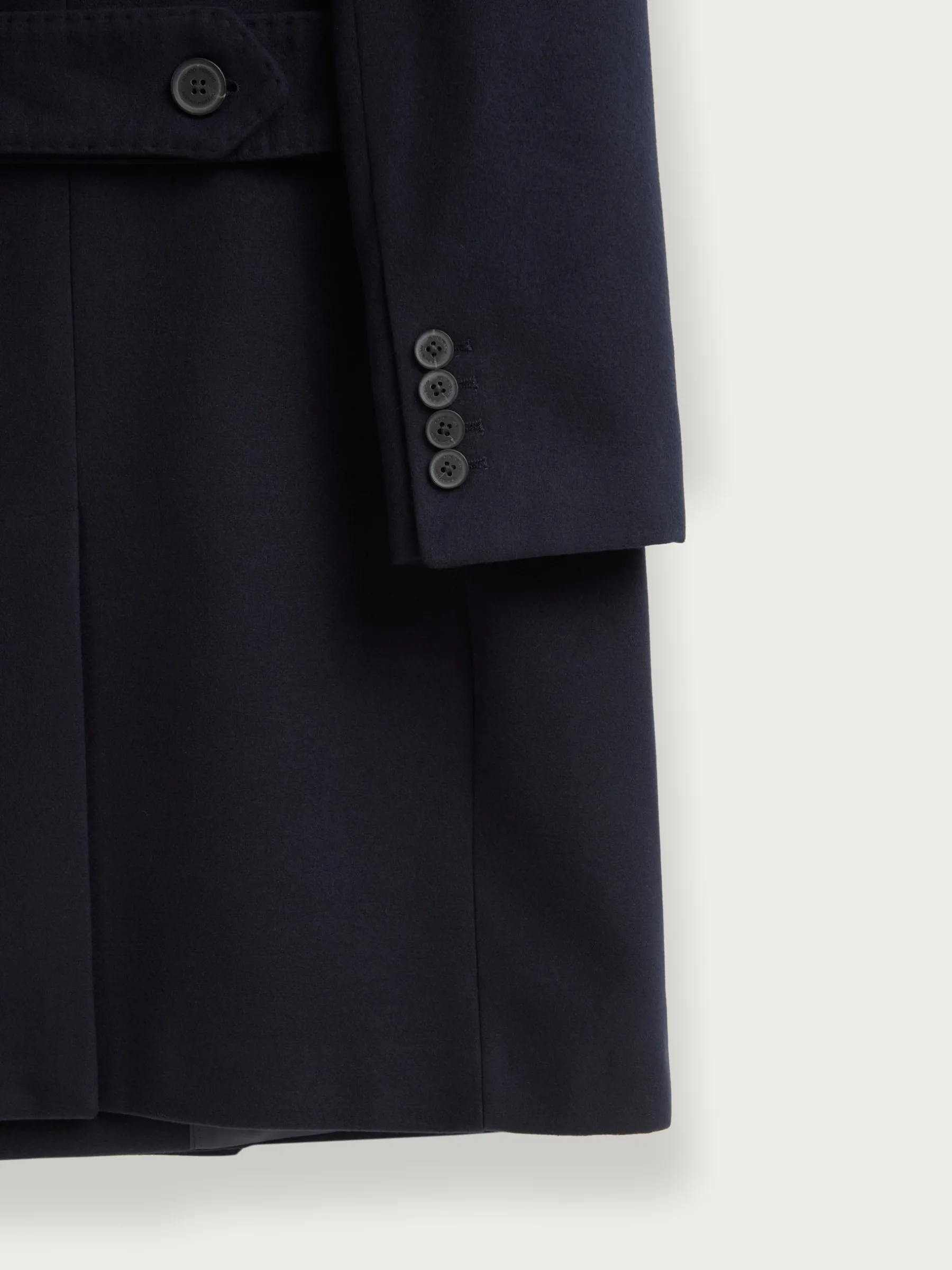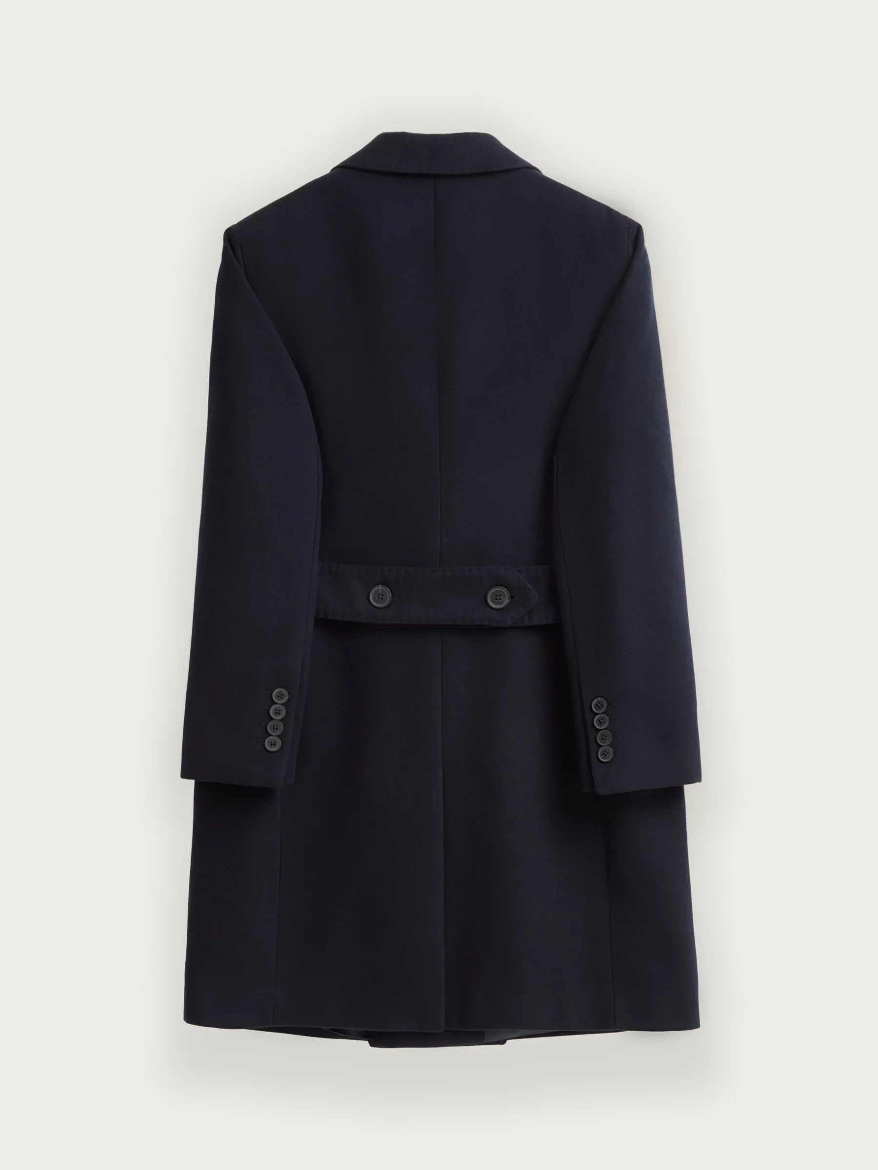 Abrigo largo que cuenta con cuello y solapa, cierre central cruzado, ajuste martingala en la cintura-espalda, bolsillo de ojal en el pecho y dos bolsillos de parche en la cintura. Manga con terminación de botones decorativos. Abertura en el bajo. Forrado en su interior con dos bolsillos.