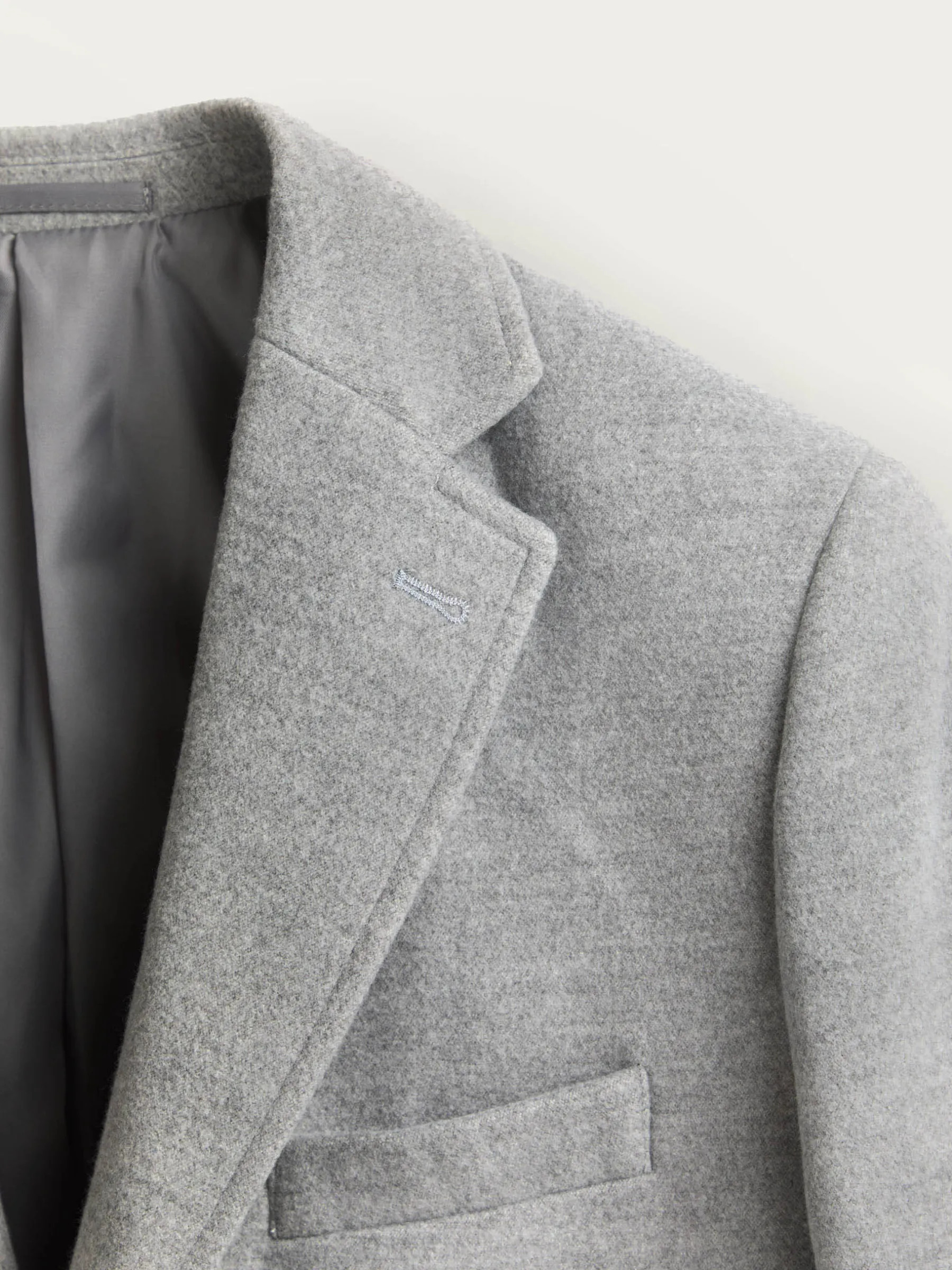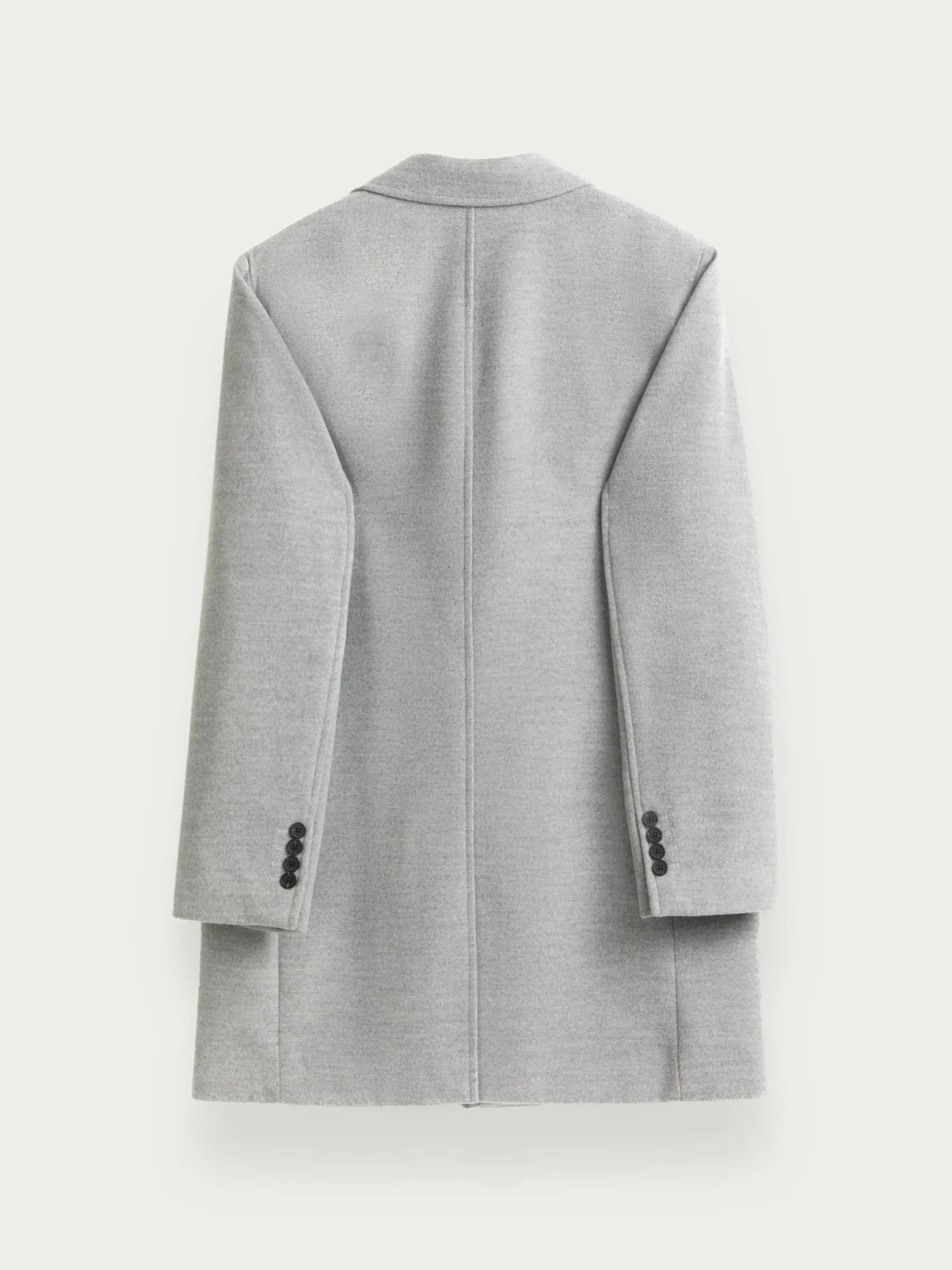 Abrigo de paño liso con cuello y solapa. Cierre central mediante botones, manga larga con botones en su terminación y dos bolsillos a la altura de la cintura. Abertura central en el bajo de la espalda. Corte regular fit.