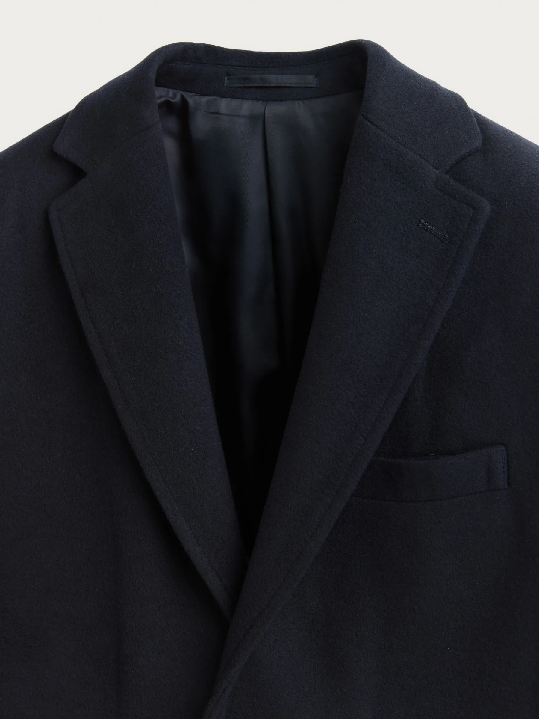 Abrigo de paño liso con cuello y solapa. Cierre central mediante botones, manga larga con botones en su terminación y dos bolsillos a la altura de la cintura. Abertura central en el bajo de la espalda. Corte regular fit.