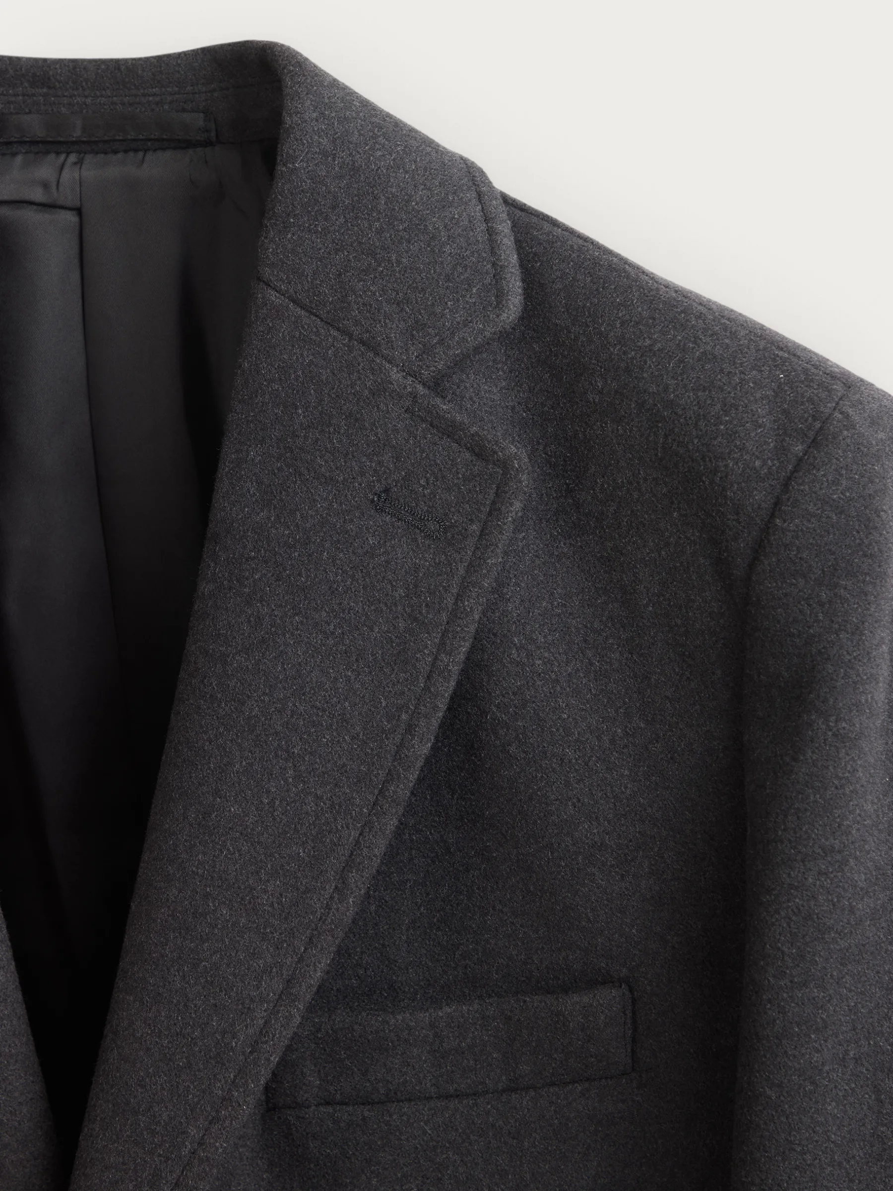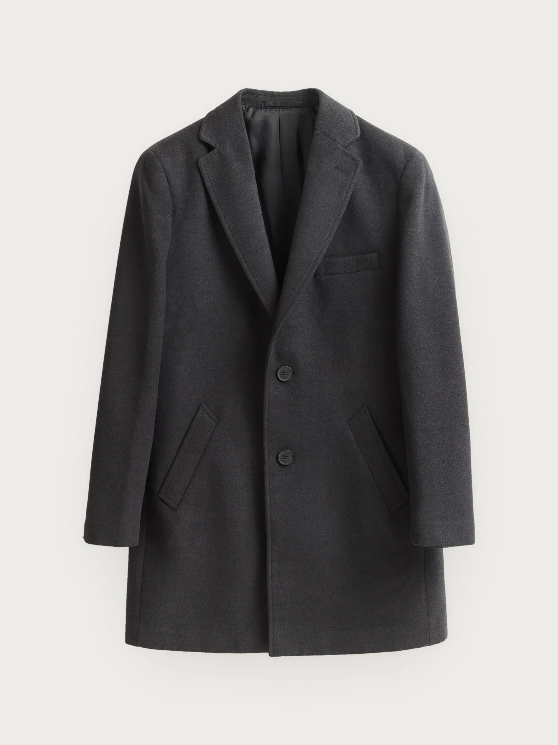 Abrigo de paño liso con cuello y solapa. Cierre central mediante botones, manga larga con botones en su terminación y dos bolsillos a la altura de la cintura. Abertura central en el bajo de la espalda. Corte regular fit.