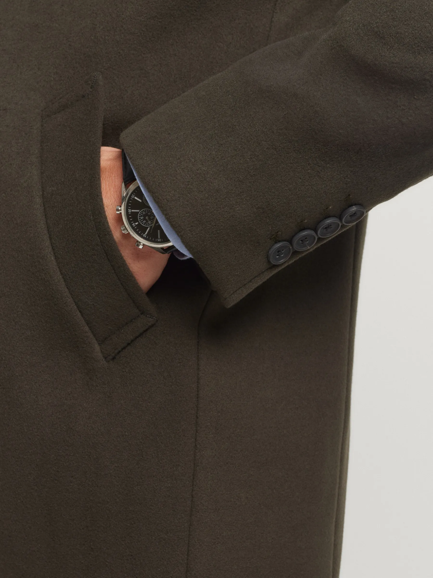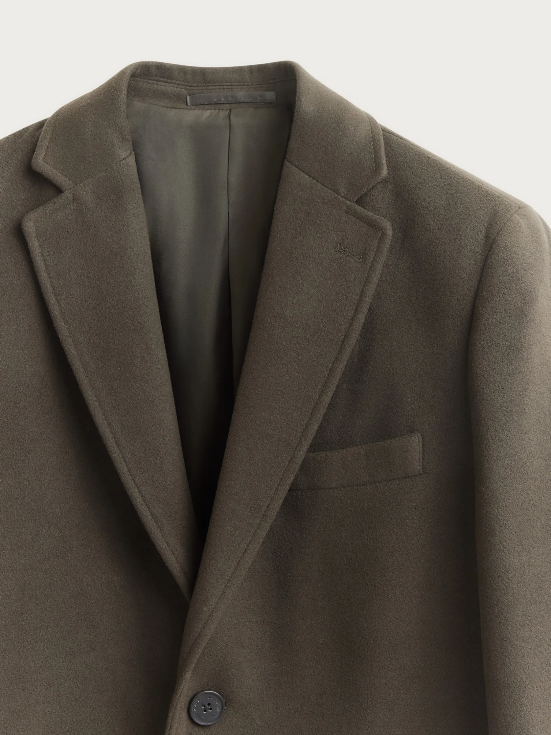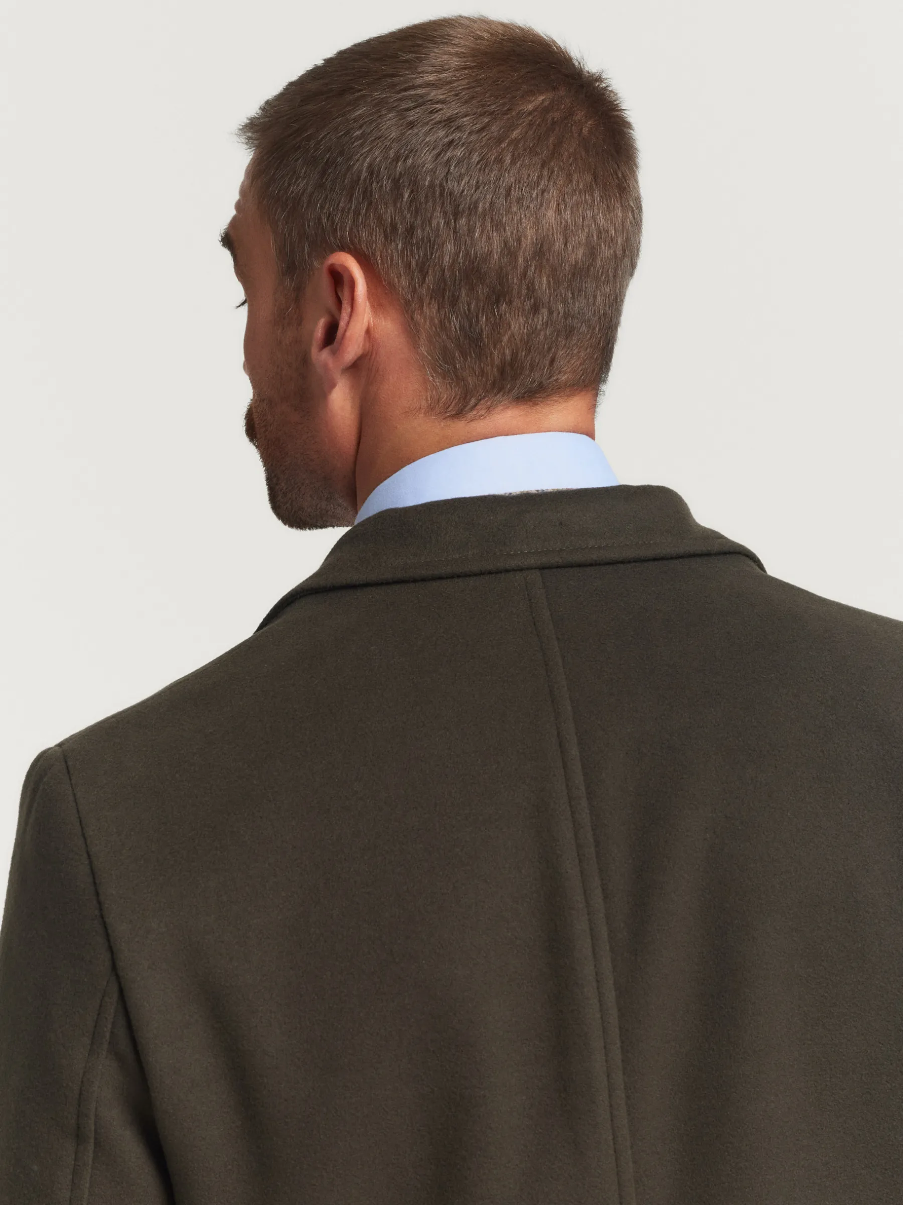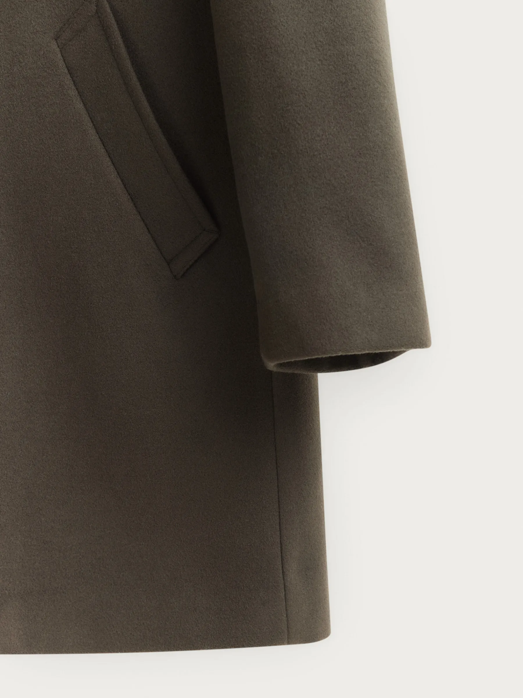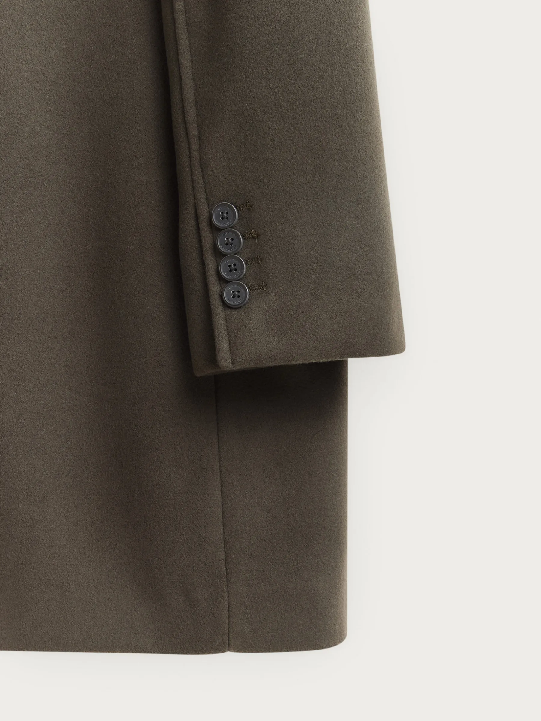 Abrigo de paño liso con cuello y solapa. Cierre central mediante botones, manga larga con botones en su terminación y dos bolsillos a la altura de la cintura. Abertura central en el bajo de la espalda. Corte regular fit.