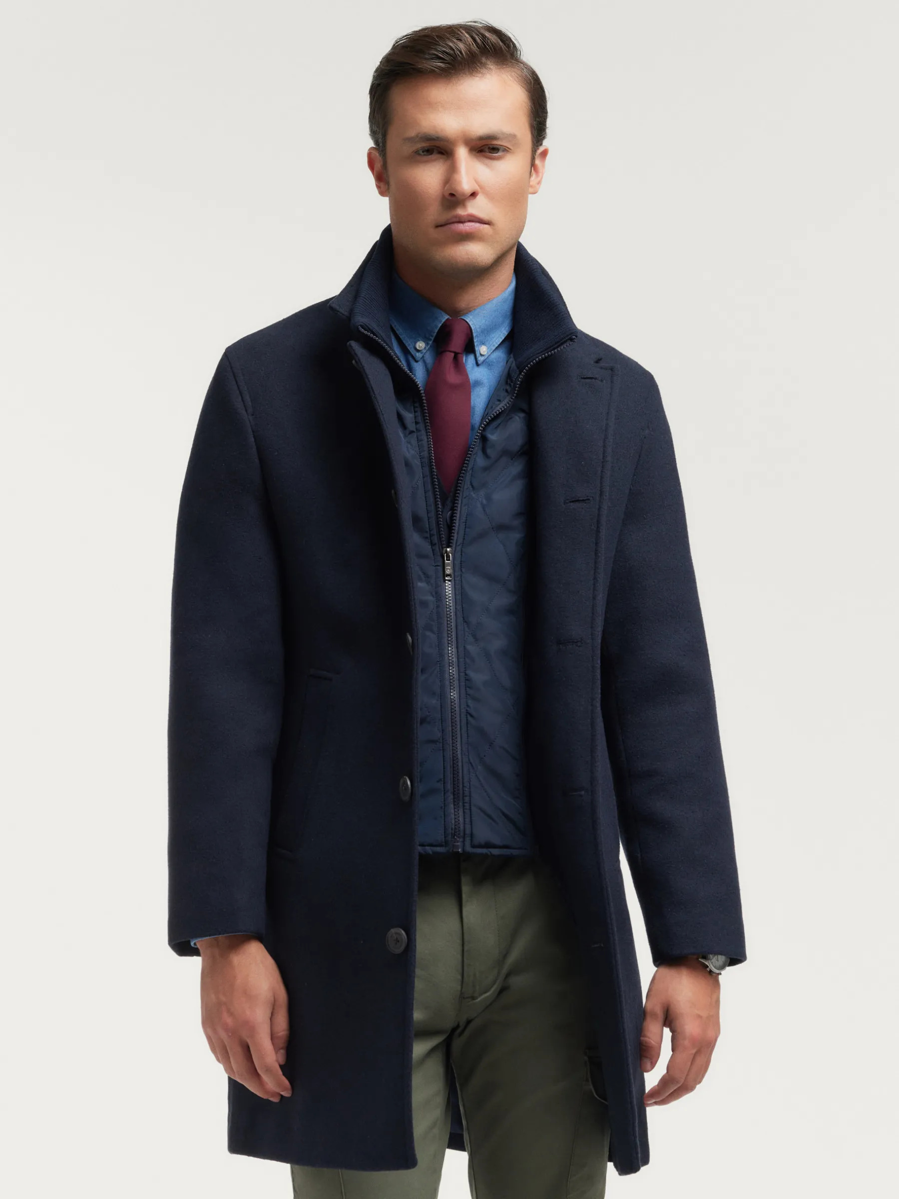 Abrigo con chalequillo interior de cuello subido y desmontable mediante cremallera. Cuenta con cuello y solapa, cierre central simple mediante botonadura efecto madera, cierre del chalequillo por cremallera y abertura en el bajo de la espalda. Dos bolsillos en la cintura y dos bolsillos en su interior. Corte regular fit.
