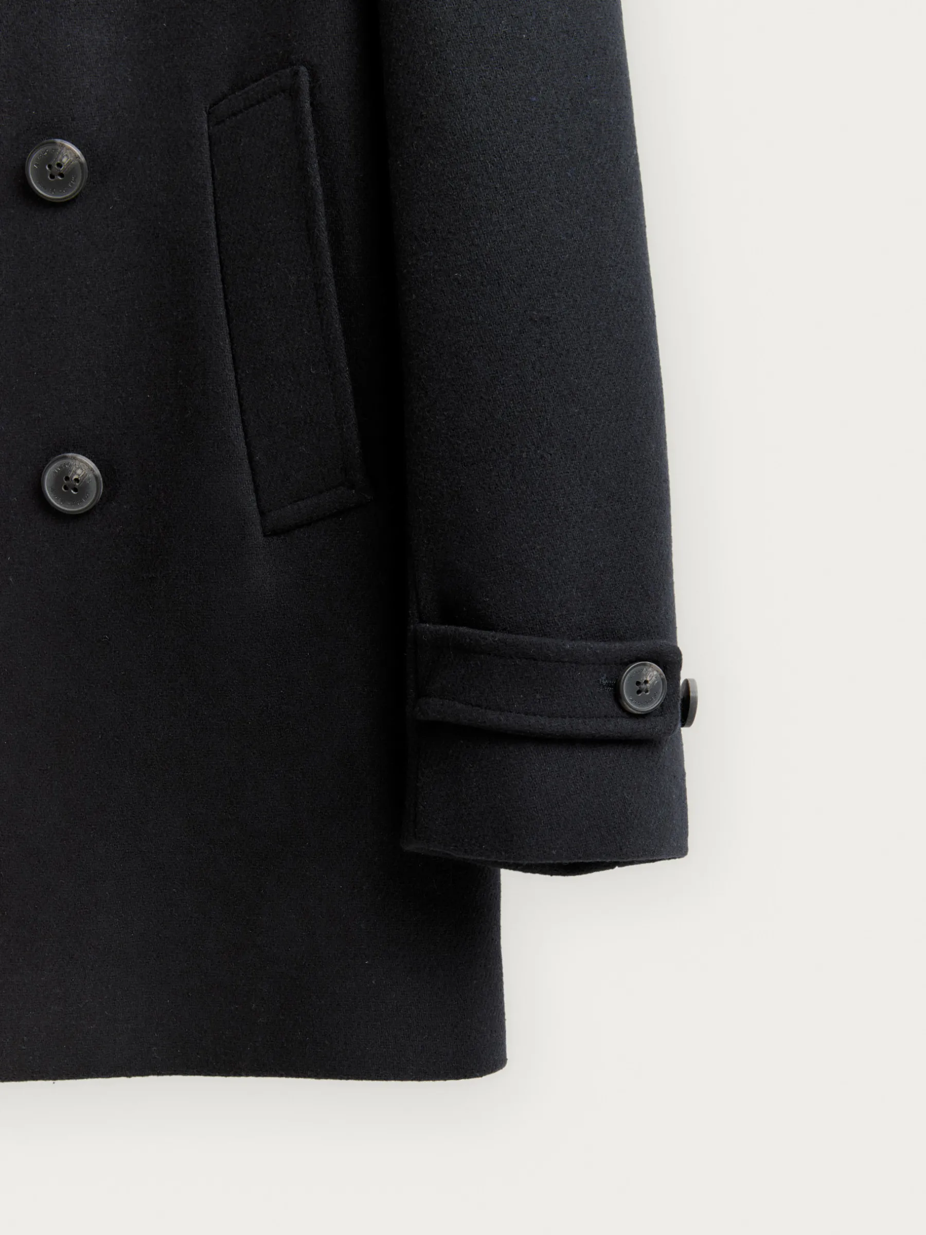 Abrigo de corte regular fit confeccionado en diferentes materiales de los cuales destaca la lana. Cuenta con cuello y solapa, cierre central cruzado, dos bolsillos en la cintura, abertura en el bajo de la espalda y detalle con dos botones en el puño de las mangas. Forrado en su interior con dos bolsillos.