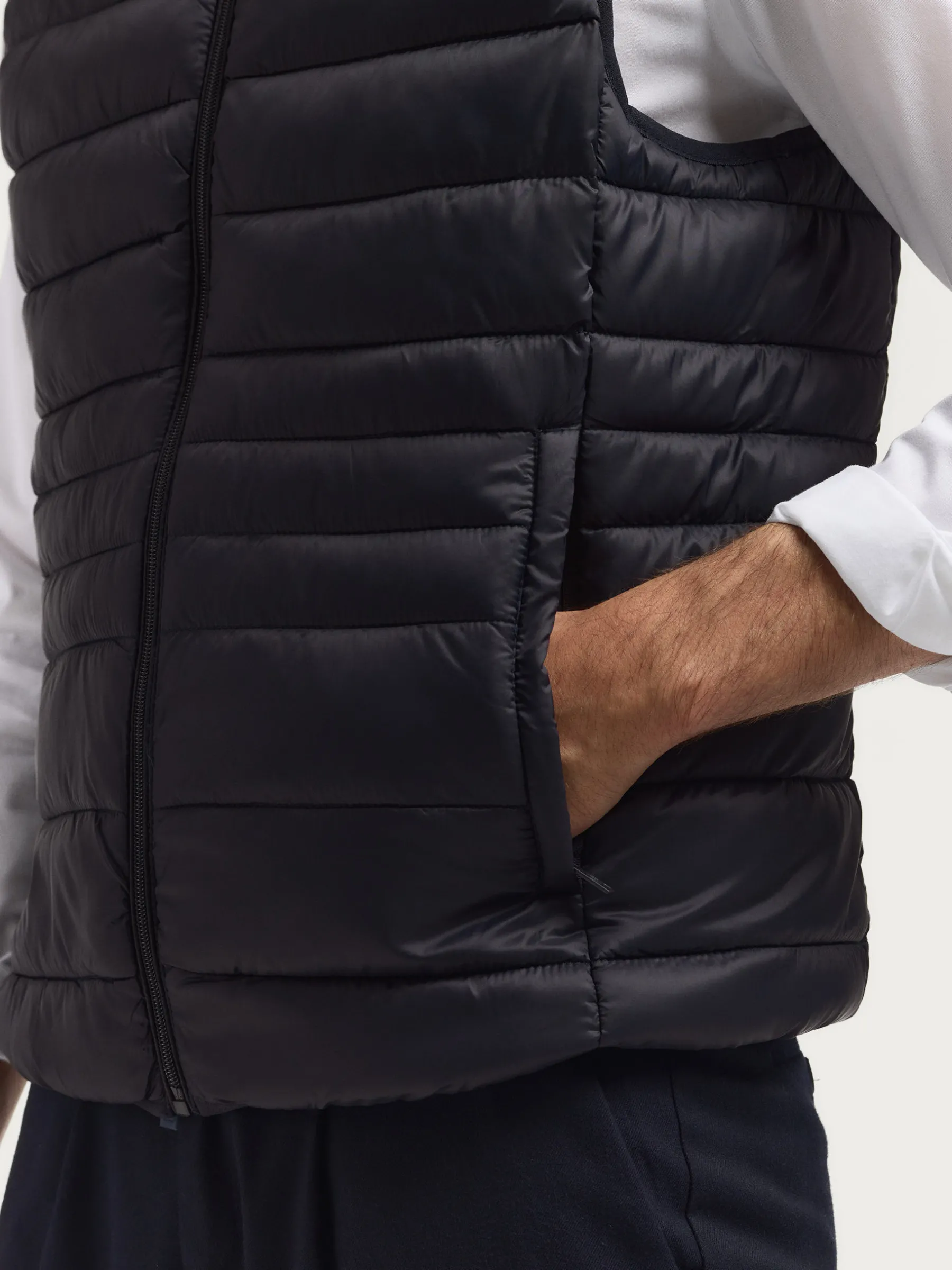 Chaleco acolchado con cuello subido. Dos bolsillo a la altura de la cintura, logo grabado en el frontal y sisa y cintura en punto elástico. Forro interior a contraste con bolsillos.