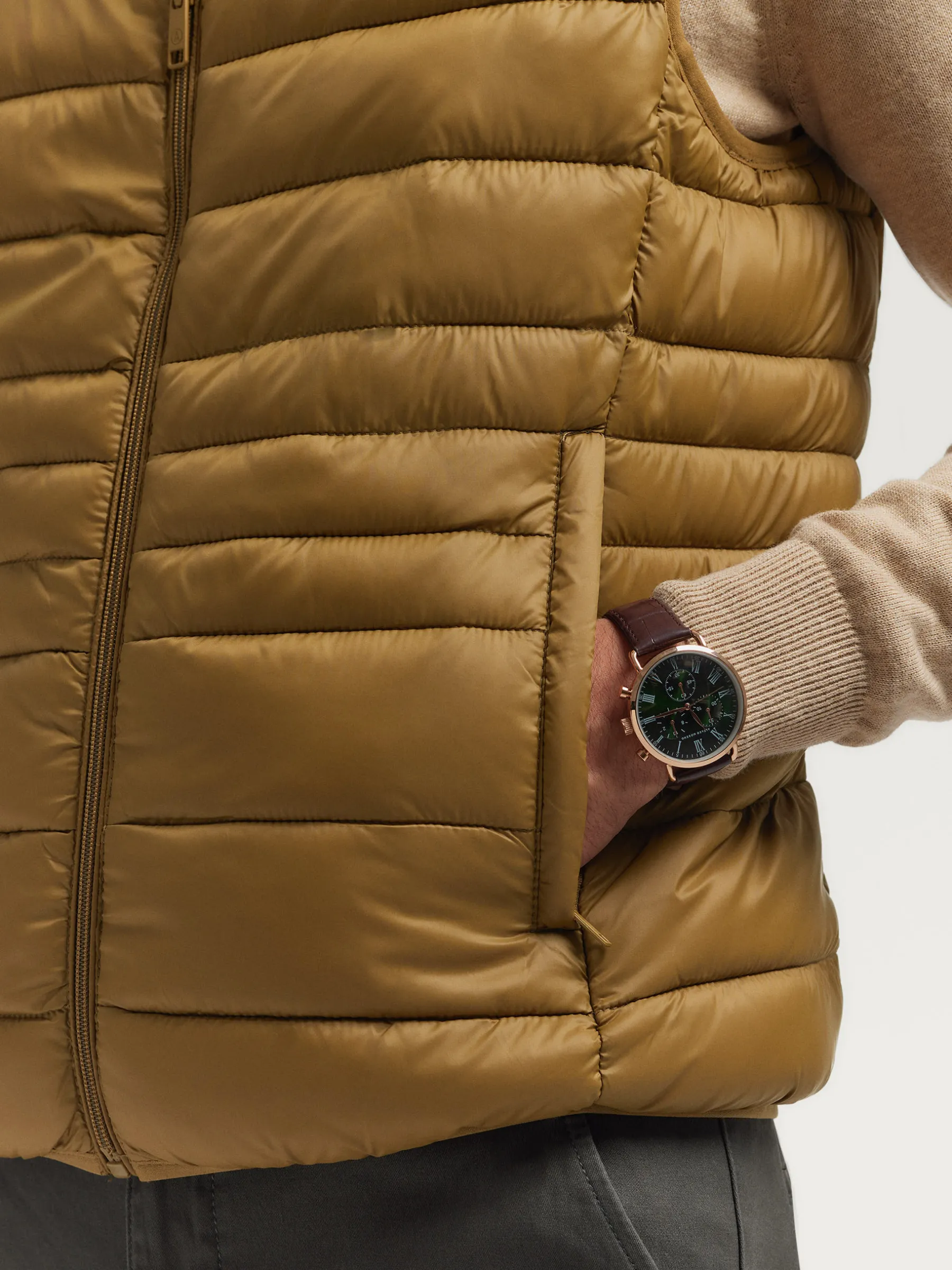 Chaleco acolchado con cuello subido. Dos bolsillo a la altura de la cintura, logo grabado en el frontal y sisa y cintura en punto elástico. Forro interior a contraste con bolsillos.