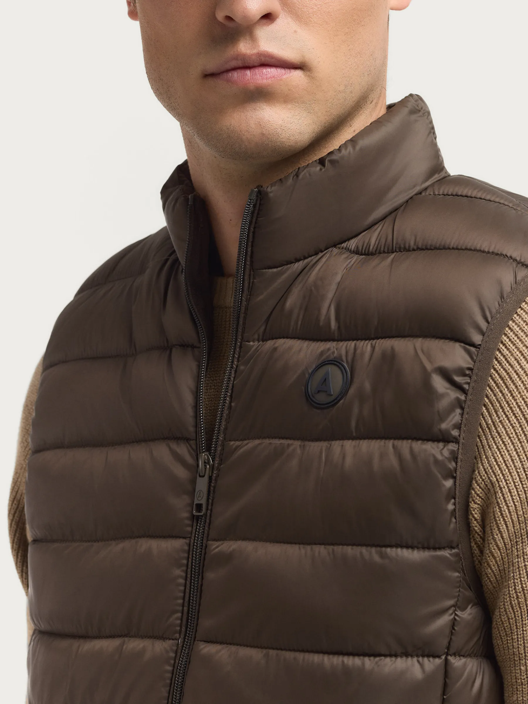 Chaleco acolchado con cuello subido. Dos bolsillo a la altura de la cintura, logo grabado en el frontal y sisa y cintura en punto elástico. Forro interior a contraste con bolsillos.