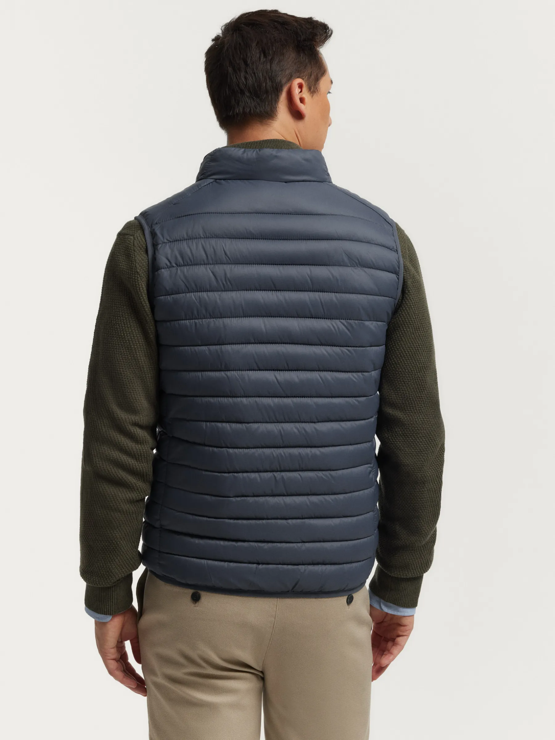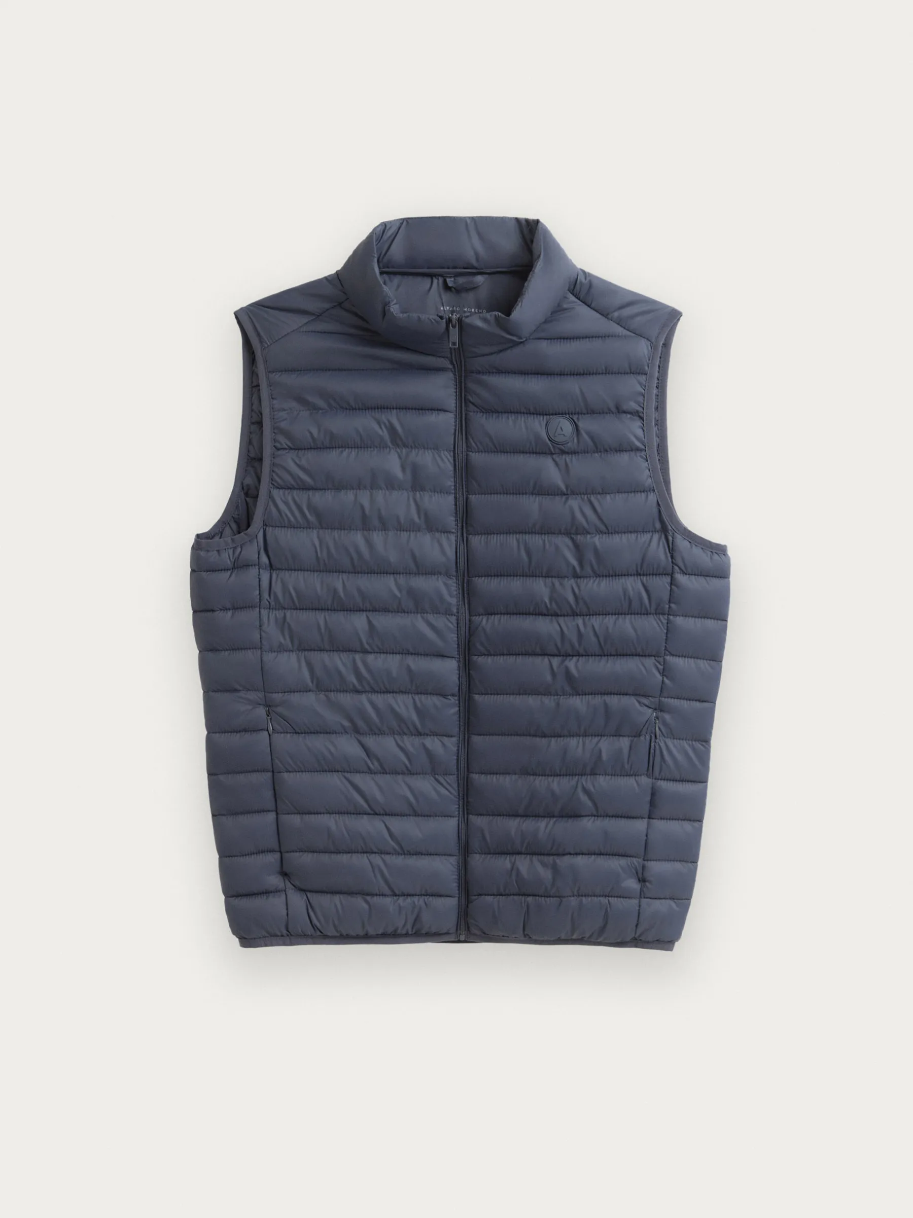 Chaleco acolchado con cuello subido y cierre central mediante cremallera, dos bolsillos a la altura de la cintura y logo de la marca grabado en el pecho. Elástico en la sisa y cintura. Forro interior a contraste con bolsillos.