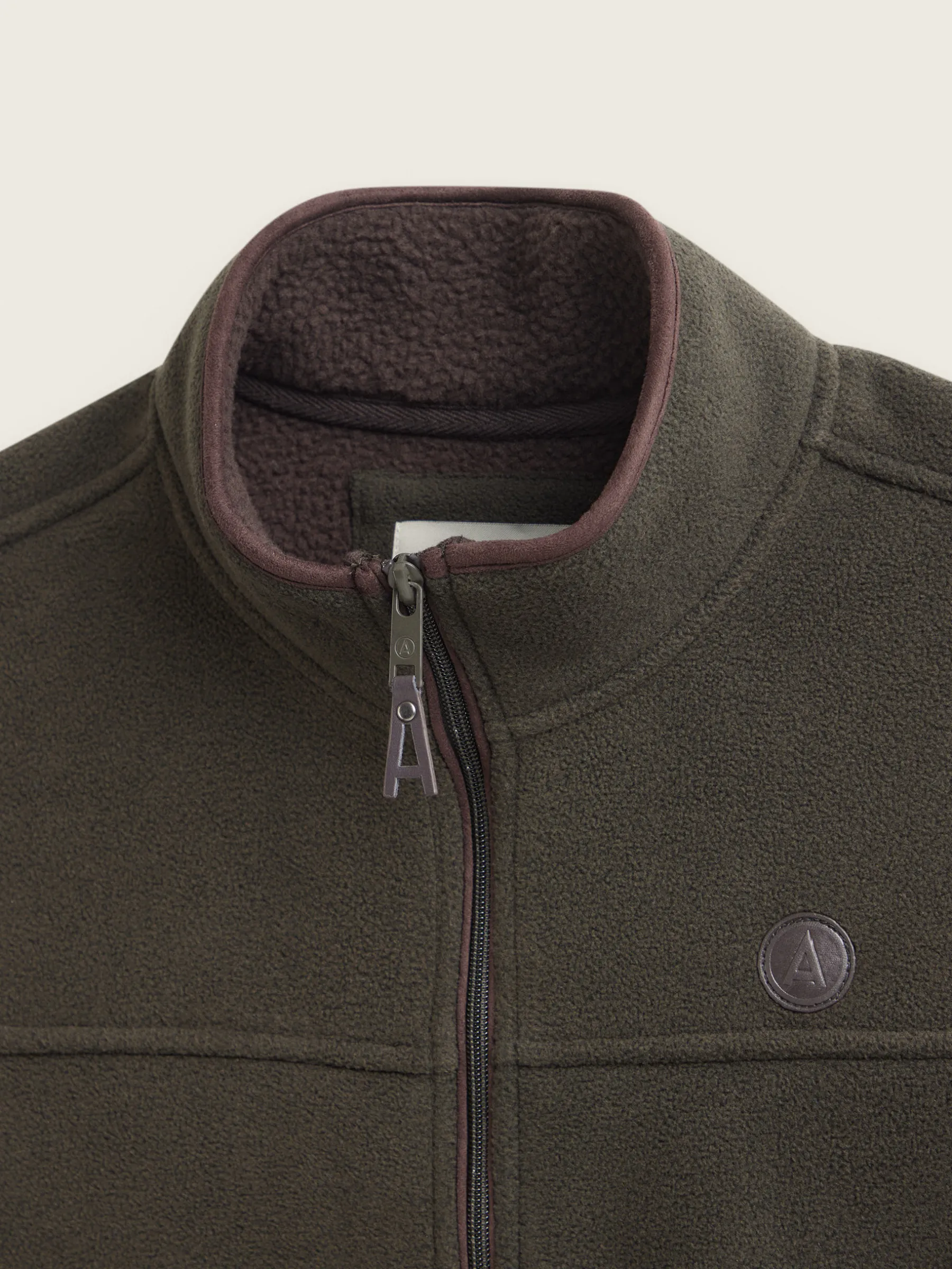 Chaleco confeccionado en tejido avivado en antelina en su exterior y forrado en su interior en borreguillo. Cuenta con cierre central mediante cremallera personalizada, dos bolsillos en su exterior y logo grabado en su frontal. Corte regular fit.
