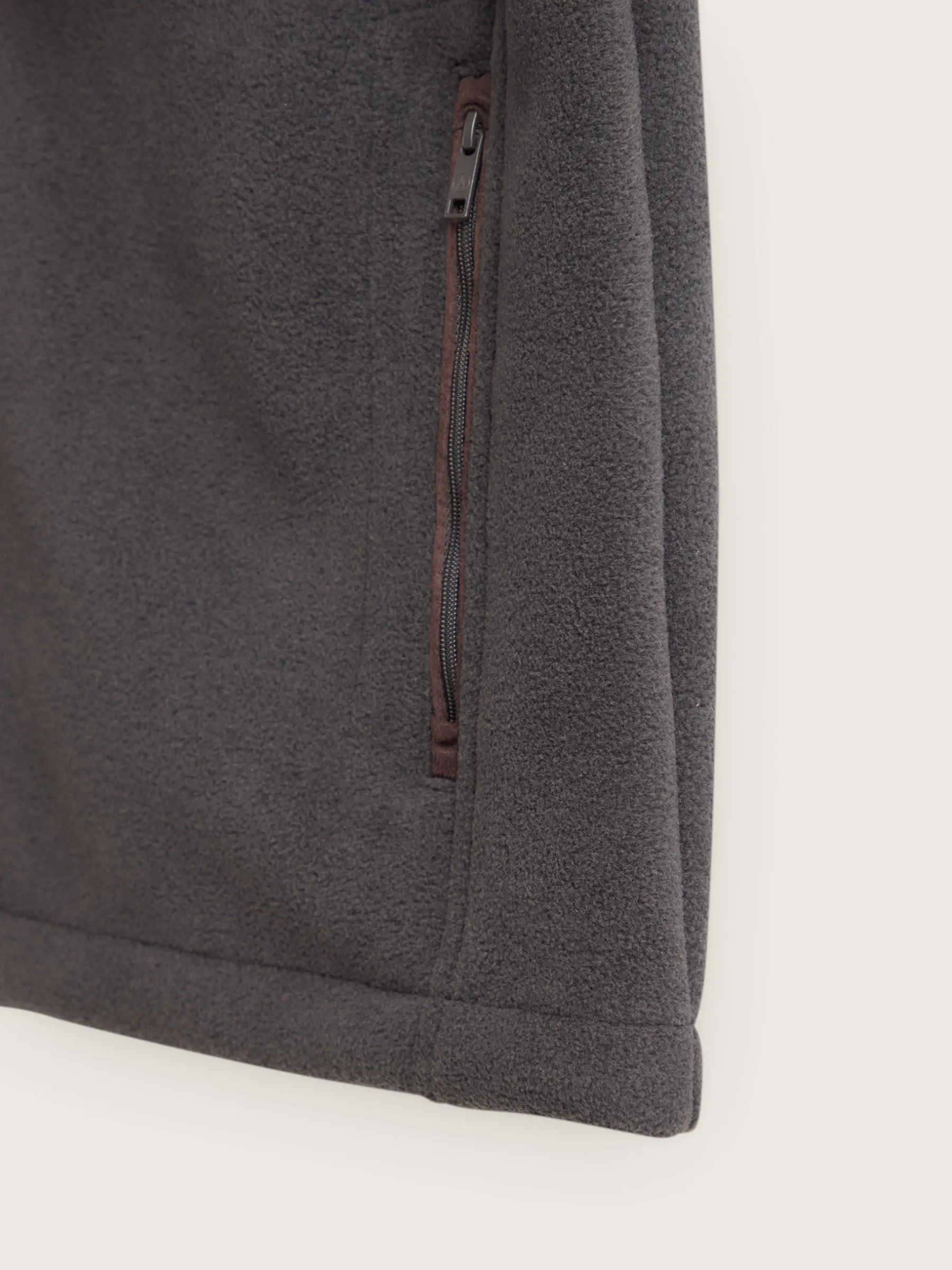 Chaleco confeccionado en tejido avivado en antelina en su exterior y forrado en su interior en borreguillo. Cuenta con cierre central mediante cremallera personalizada, dos bolsillos en su exterior y logo grabado en su frontal. Corte regular fit.