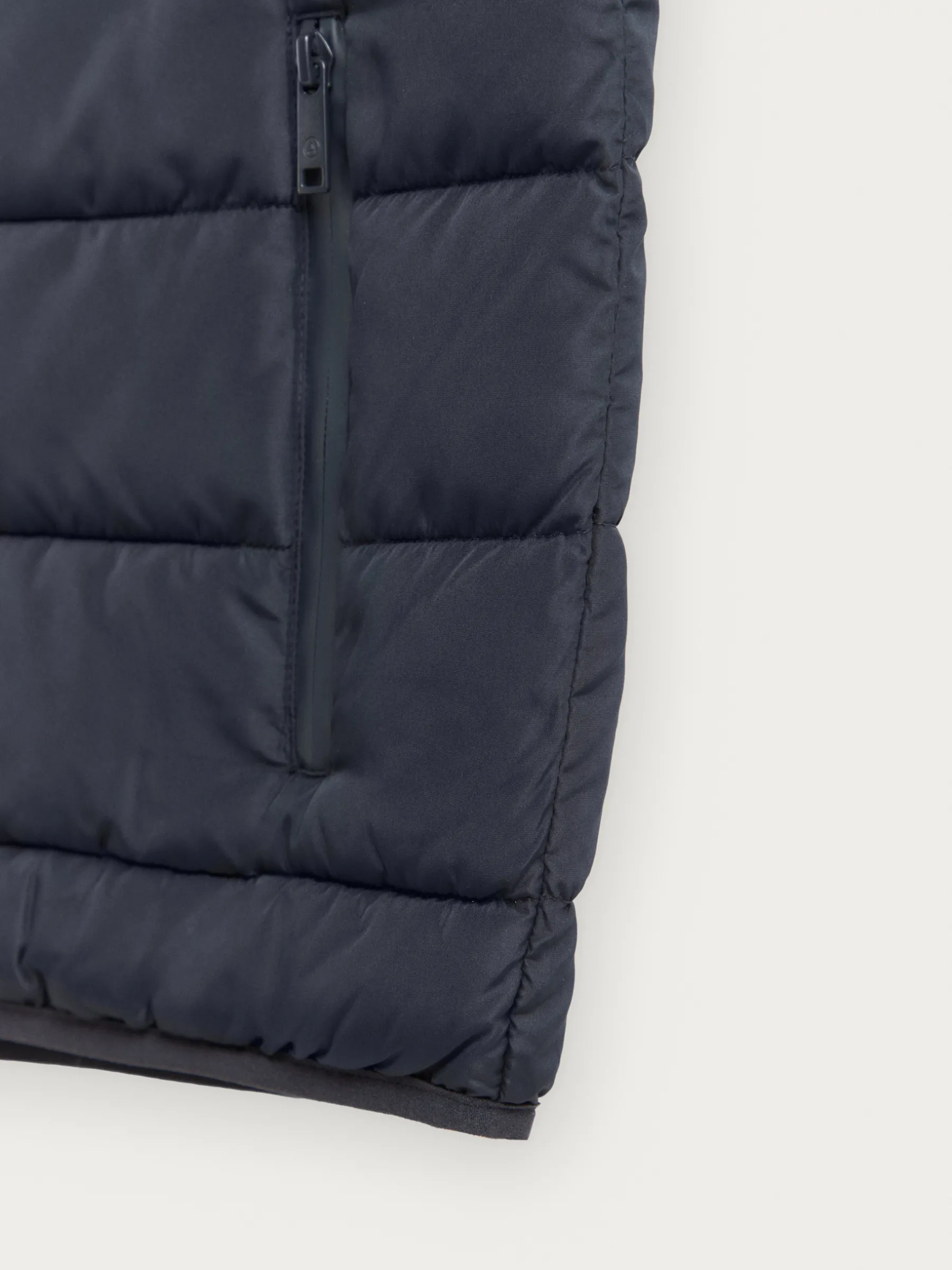 Chaleco acolchado con cuello subido y cierre central mediante doble cremallera, dos bolsillos a la altura de la cintura con cierre de cremallera y logo de la marca grabado en el frontal al tono. Elástico en la sisa y cintura. Cremalleras termoselladas. Interior con dos bolsillos y doble compartimento cada uno.