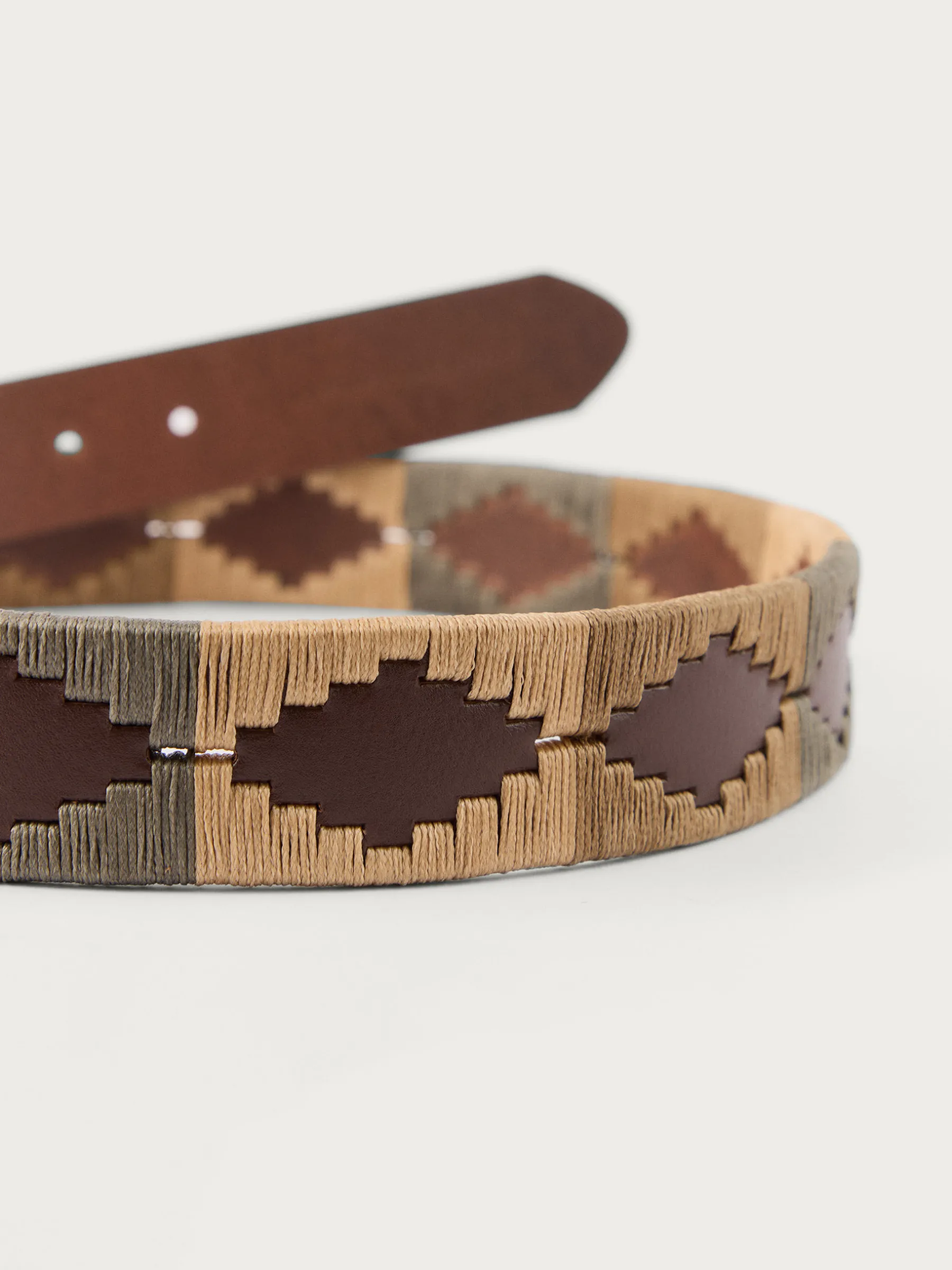 Cinturón con detalles personalizados a contraste y cierre central mediante hebilla metálica y pasador.