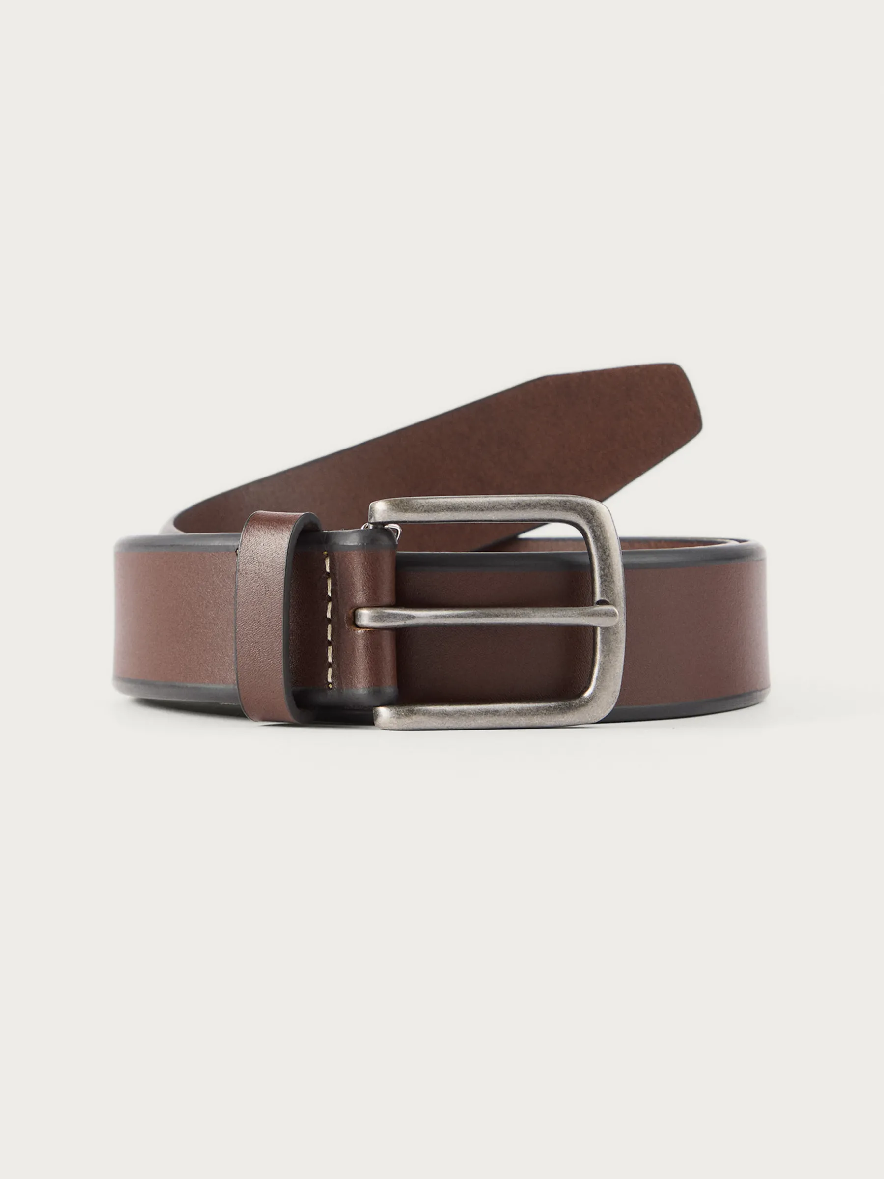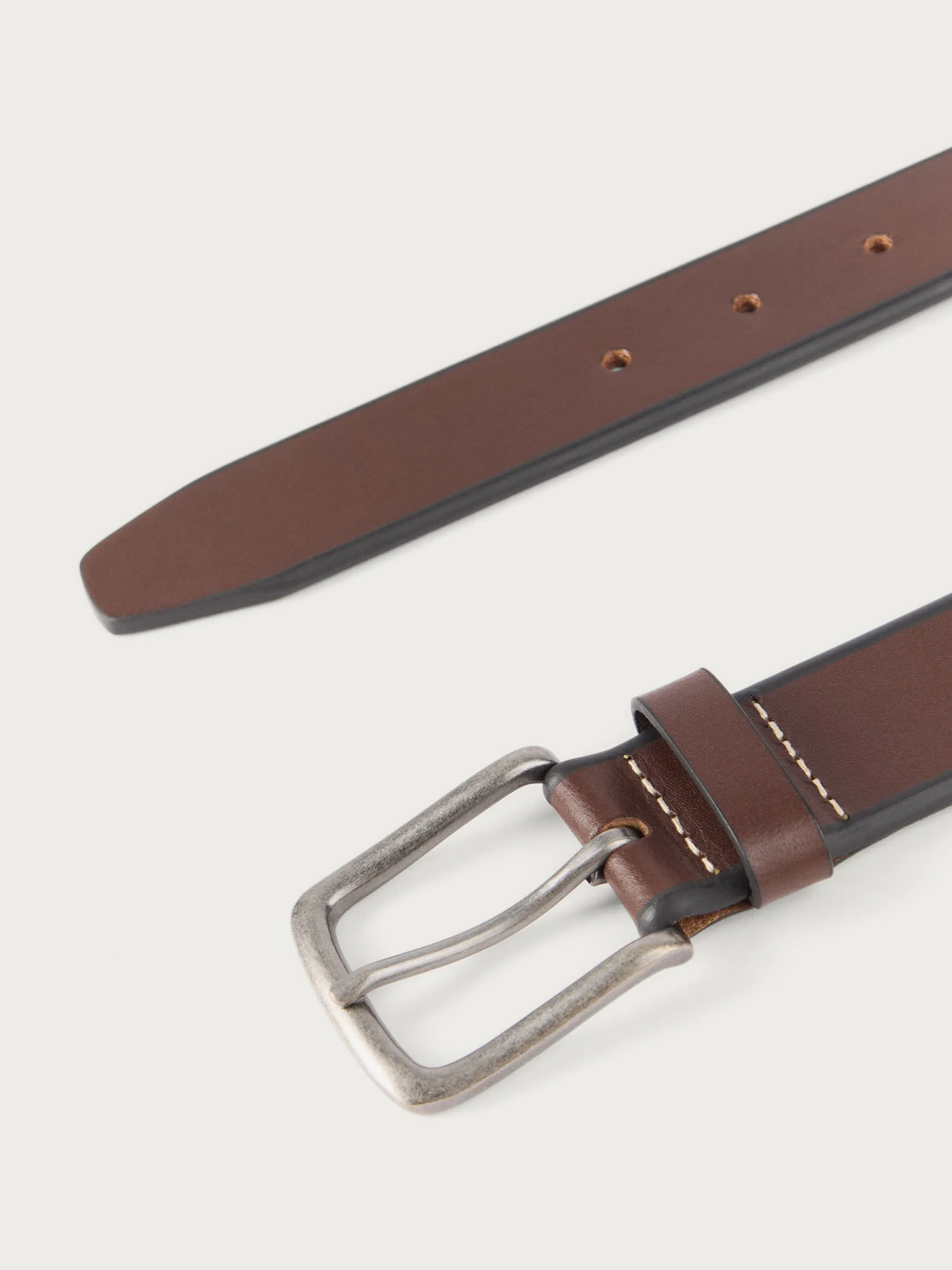 Cinturón confeccionado en piel con cierre central mediante hebilla metálica en color plata y pasador al tono del cinturón. Detalles de pespuntes a contraste.