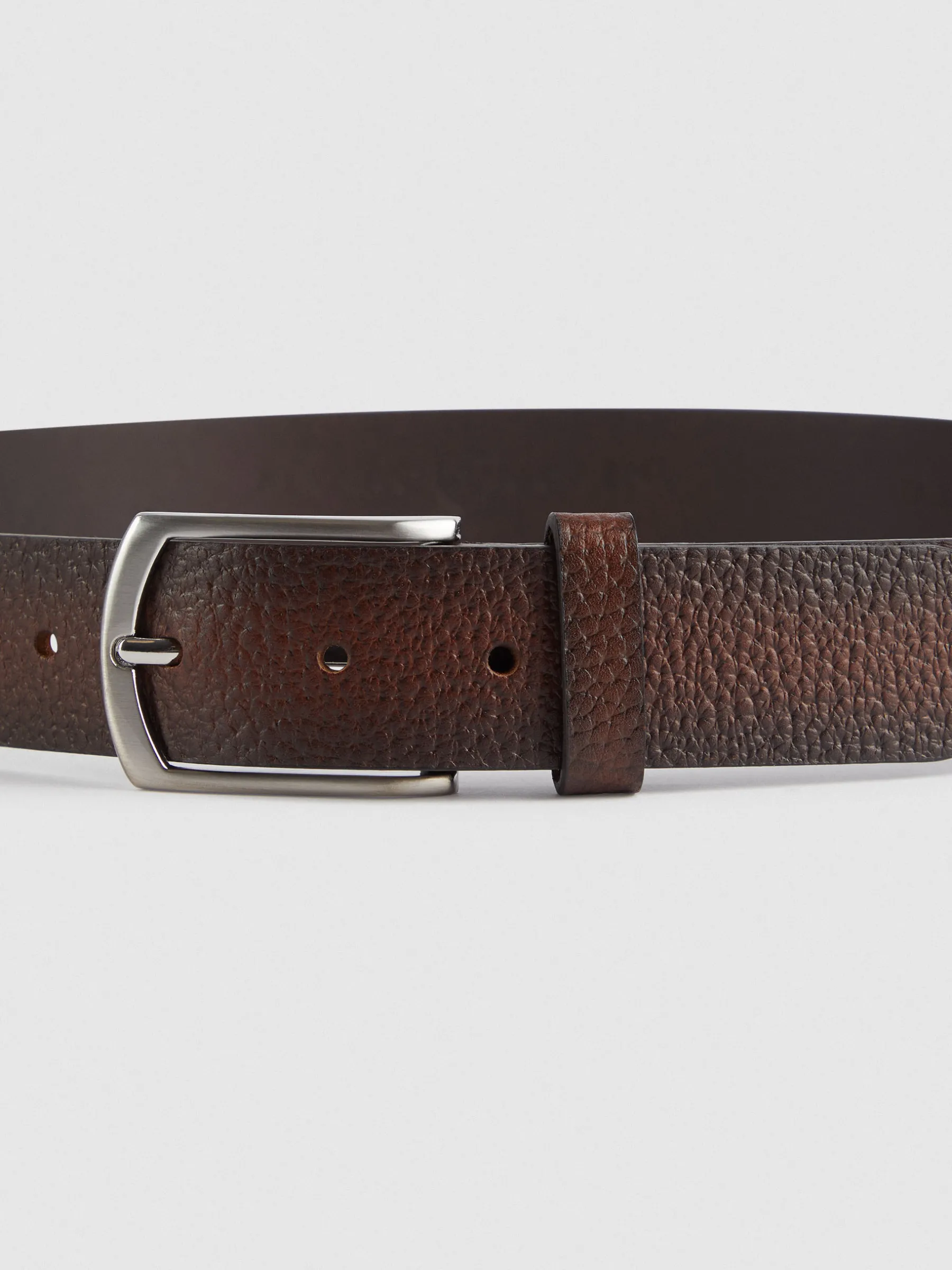 Cinturón de vestir confeccionado en piel de estilo rugoso. Cierre central mediante hebilla metálica y pasador al tono.